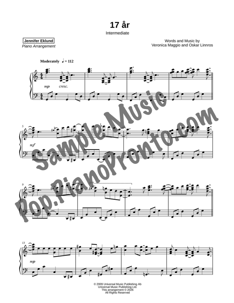 17 år (Seventeen years old), as performed by Veronica Maggio, stylishly arranged for intermediate piano by Jennifer Eklund.
