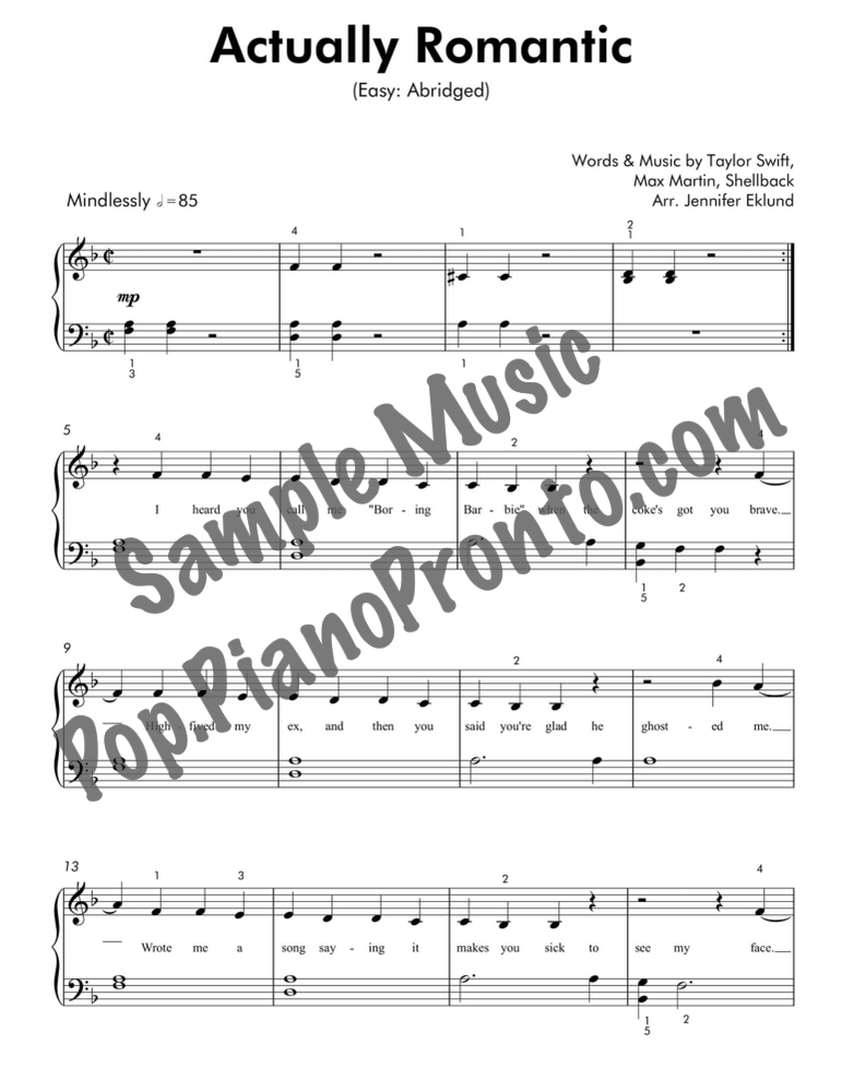 Actually Romantic, as performed by Taylor Swift from album "The Life of a Showgirl" stylishly abridged and arranged for easy piano by Jennifer Eklund. This version has been transposed up a half-step to the key of F major.