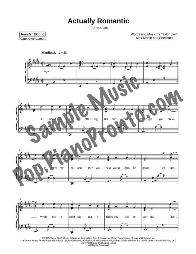 Actually Romantic, as performed by Taylor Swift from album "The Life of a Showgirl" set here as a sparkling lyrical piano solo for intermediates by Jennifer Eklund.