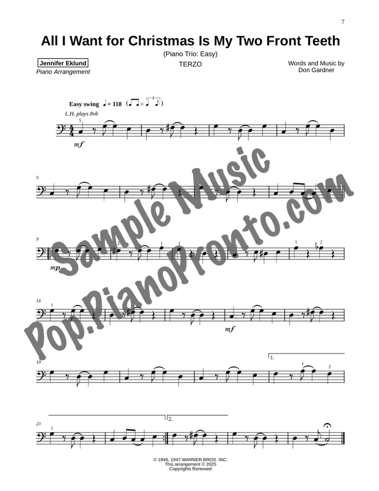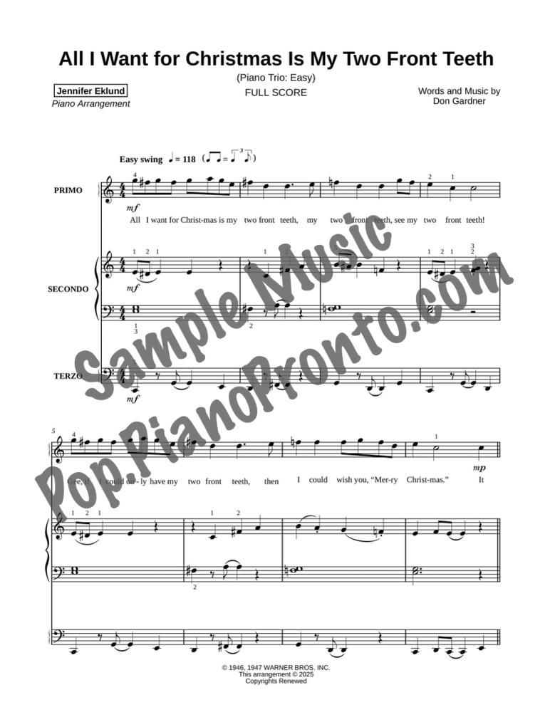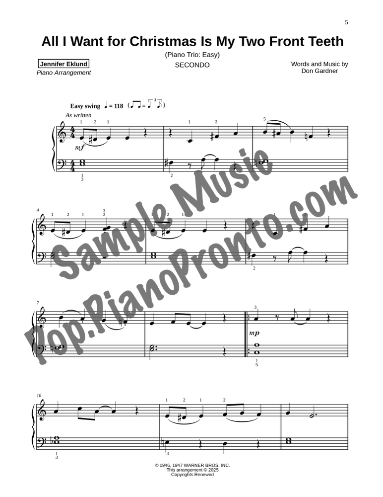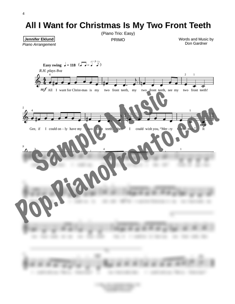 All I Want for Christmas Is My Two Front Teeth, a jovial holiday favorite, stylishly arranged as an easy trio for late beginners and early intermediates by Jennifer Eklund. This ensemble piece serves as a great introduction to easy collaborative playing and will also be effective in group piano settings with multiple keyboards. Purchase includes separated parts and a full conductors score.