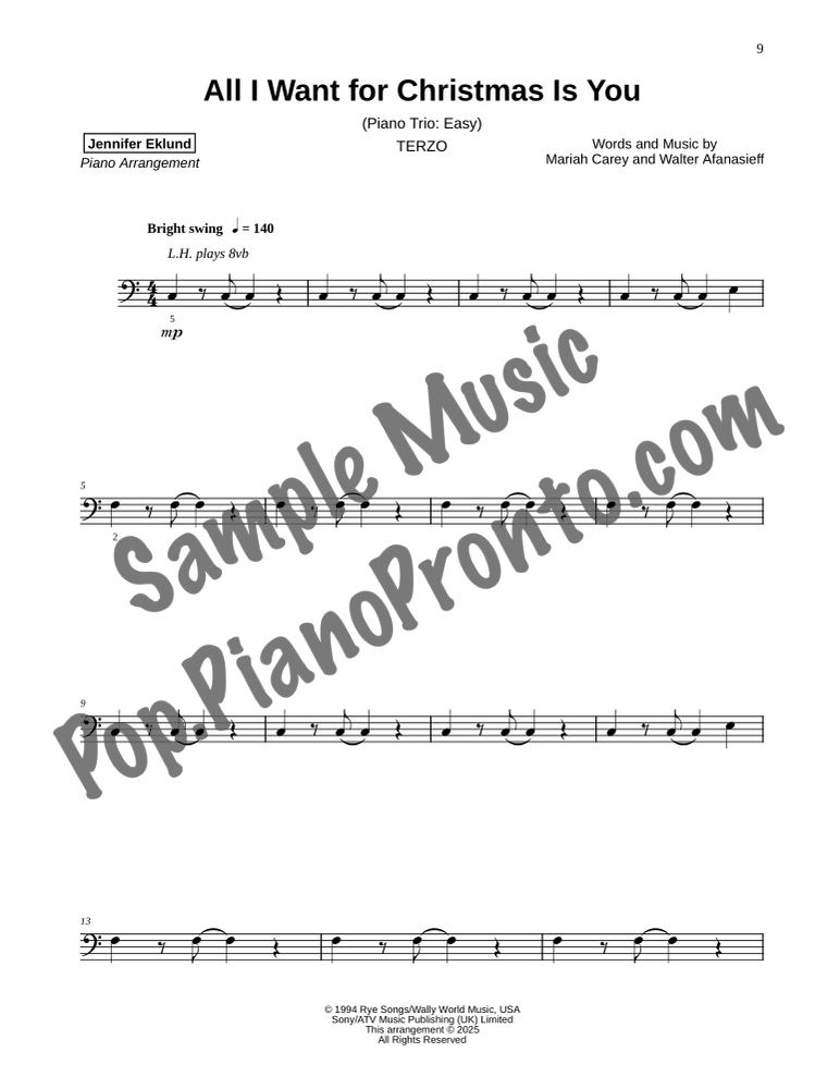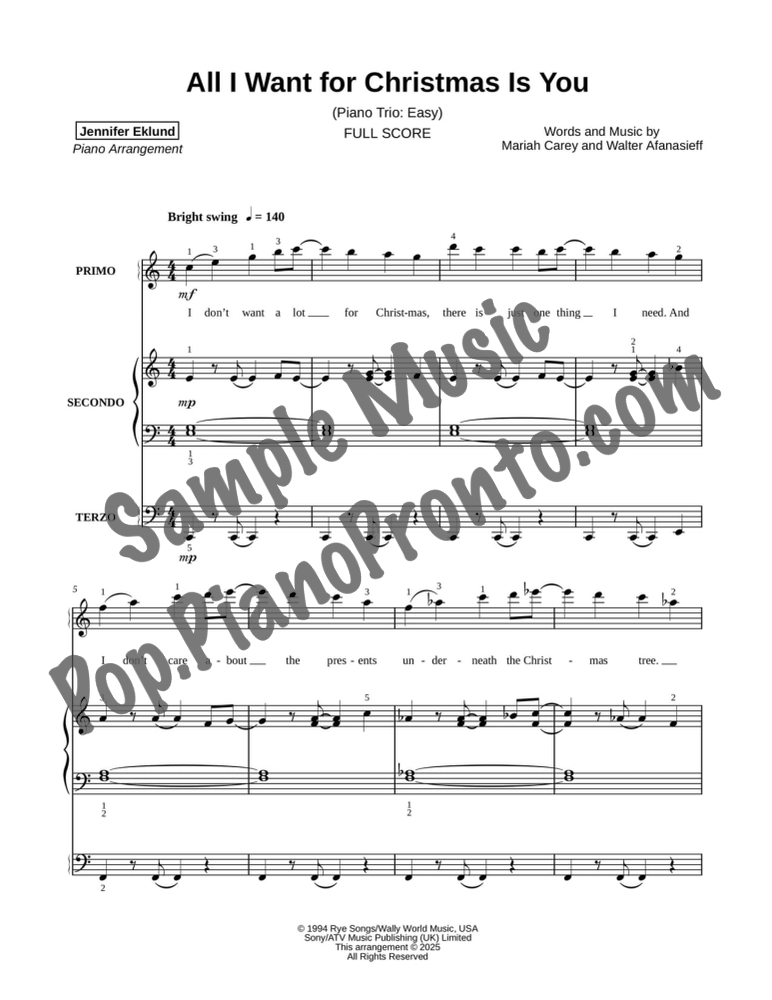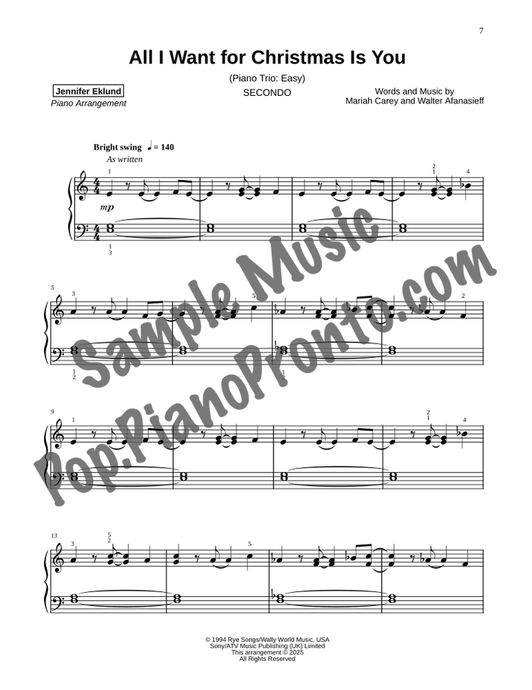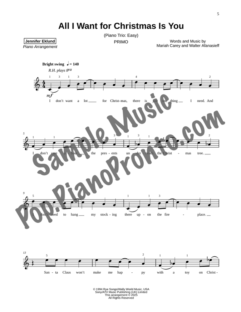 All I Want for Christmas Is You, a perennial holiday favorite, stylishly arranged as an easy trio for late beginners and early intermediates by Jennifer Eklund. This ensemble piece serves as a great introduction to easy collaborative playing and will also be effective in group piano settings with multiple keyboards. Purchase includes separated parts and a full conductors score.