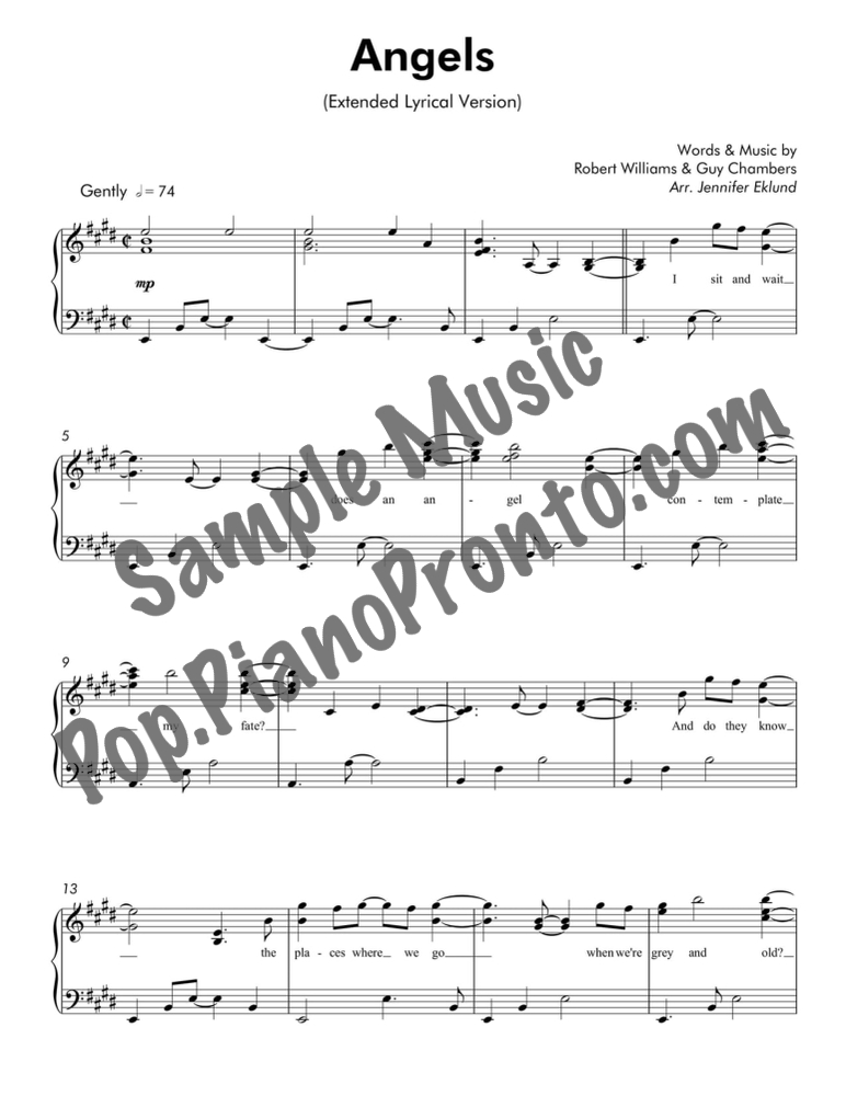 Angels, as performed by Robbie Williams, in a mellow arrangement for late intermediate piano by Jennifer Eklund. This extended version has a total run-time around 5:00.