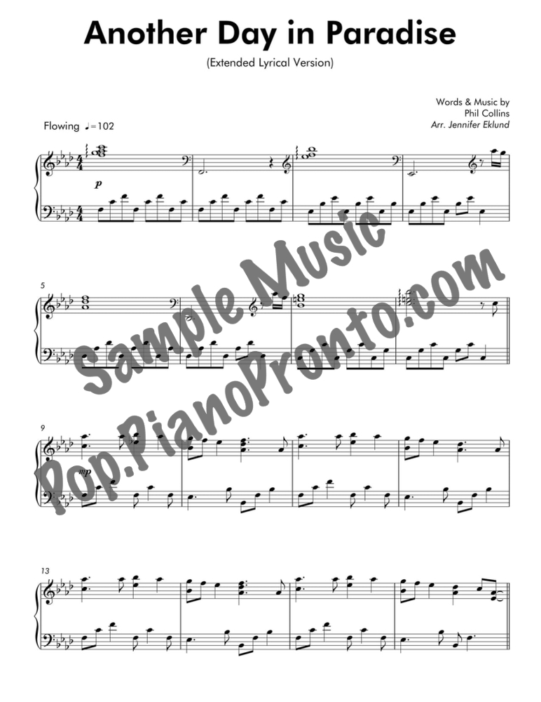 Another Day in Paradise, as performed by Phil Collins, in a mellow arrangement for late intermediate piano by Jennifer Eklund. This extended version has a total run-time around 6:00.