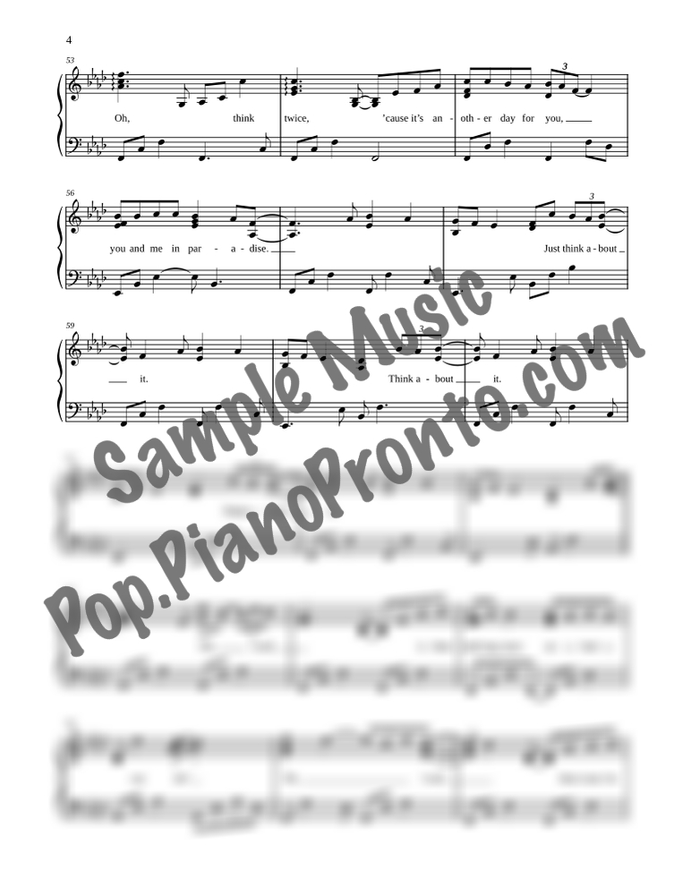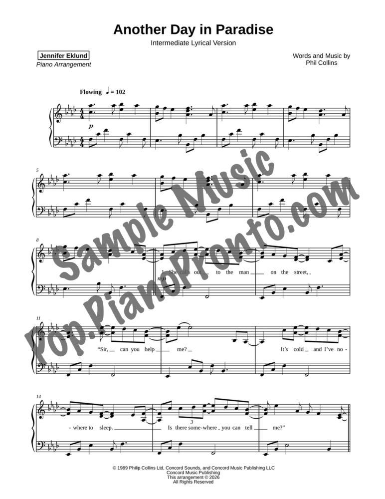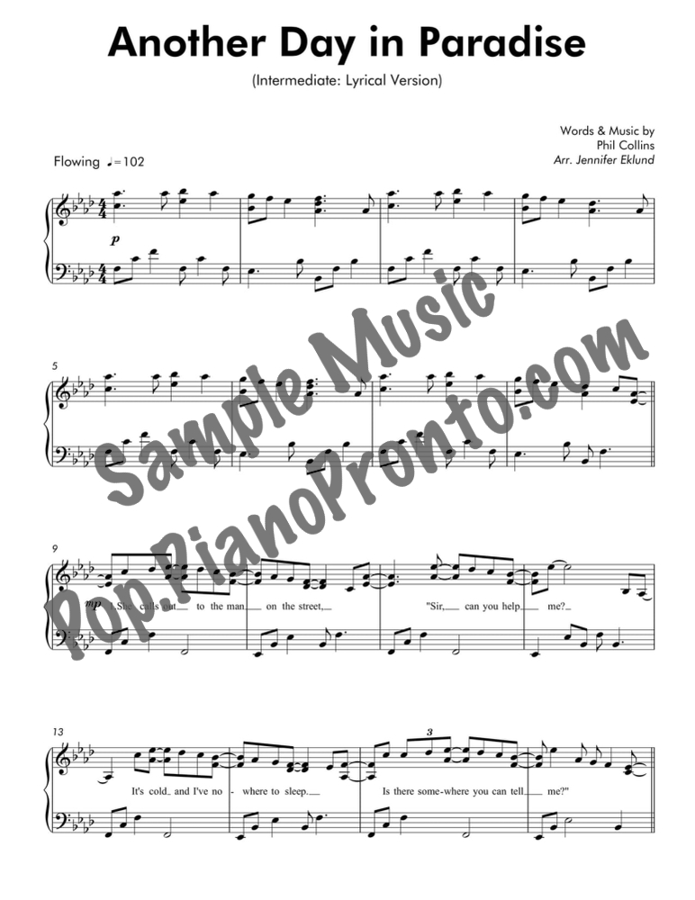 Another Day in Paradise, as performed by Phil Collins, in a lyrical arrangement for intermediate piano by Jennifer Eklund. This version has a total run-time around 4:45.