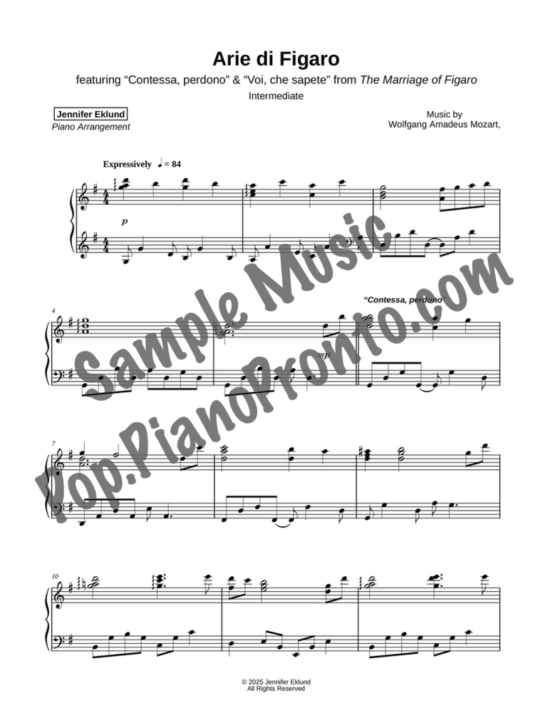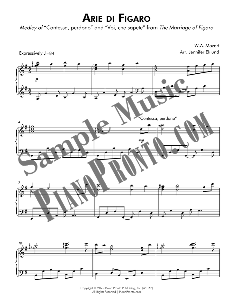 Arie di Figaro, features two iconic arias, "Contessa, perdono" and "Voi, che sapete," from Mozart's opera "The Marriage of Figaro." This contemporary lyrical medley by Jennifer Eklund is ideal for intermediates and late intermediates.
