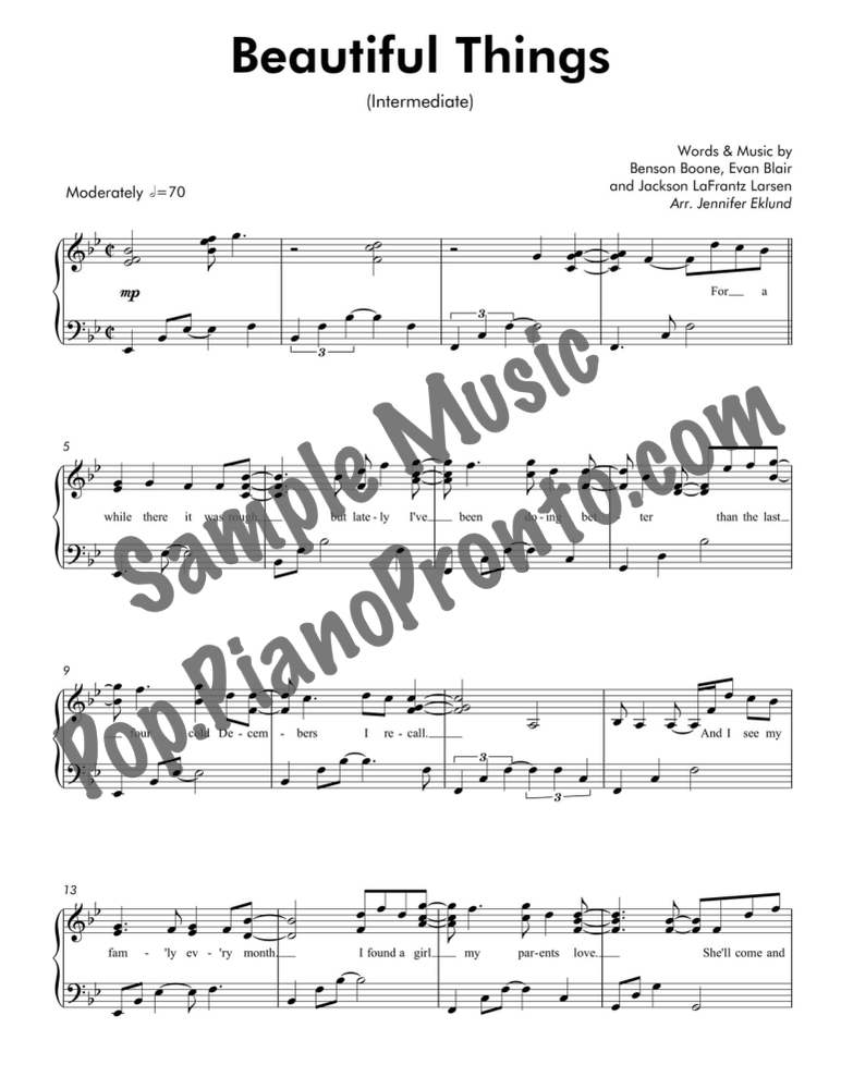 Beautiful Things, as performed by Benson Boone, stylishly arranged for intermediate piano by Jennifer Eklund.
