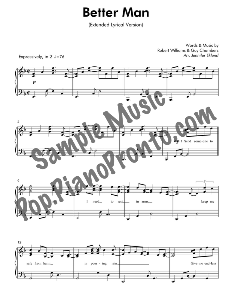 Better Man, as performed by Robbie Williams, set here as a sparkling lyrical piano solo for late intermediates by Jennifer Eklund. This is an extended version that has the vocal range set higher and repeated sections for a total run-time just over 5 minutes.
