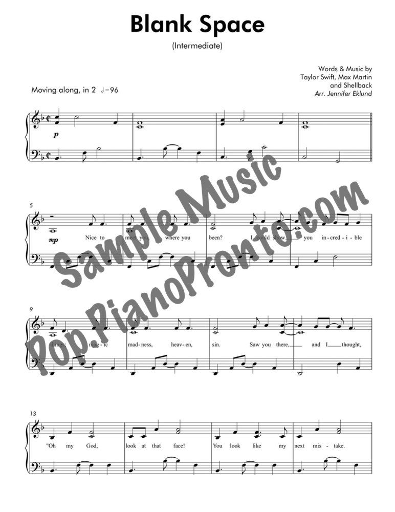Blank Space, as performed by Taylor Swift, set as a lyrical piano solo for intermediate piano by Jennifer Eklund.