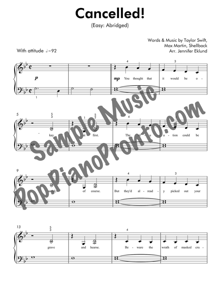 Cancelled!, as performed by Taylor Swift from album "The Life of a Showgirl" stylishly abridged and arranged for easy piano by Jennifer Eklund.
