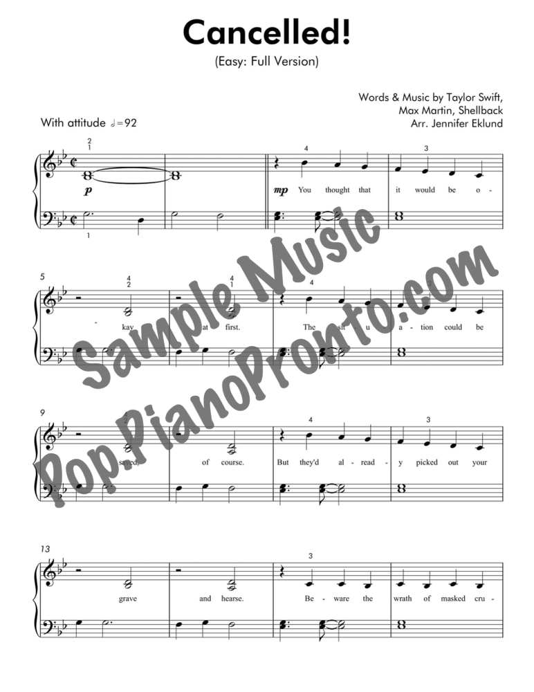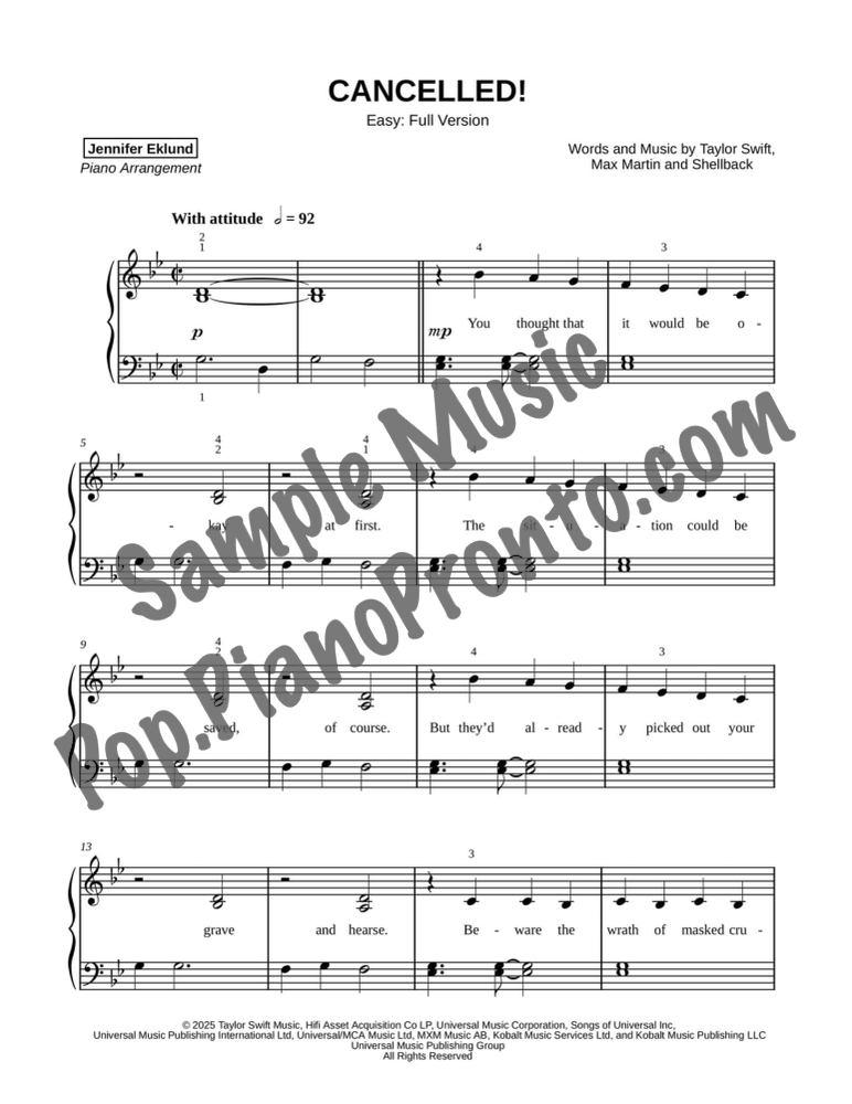 Cancelled!, as performed by Taylor Swift from album "The Life of a Showgirl" stylishly arranged for easy piano by Jennifer Eklund. This is the full album version of the song.