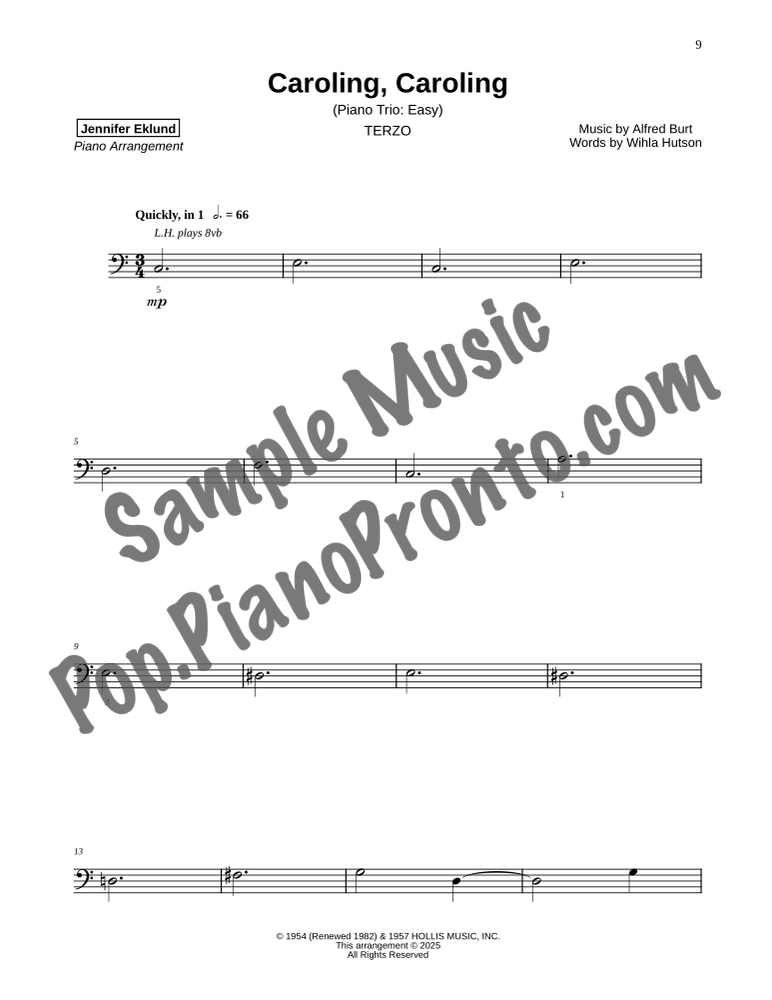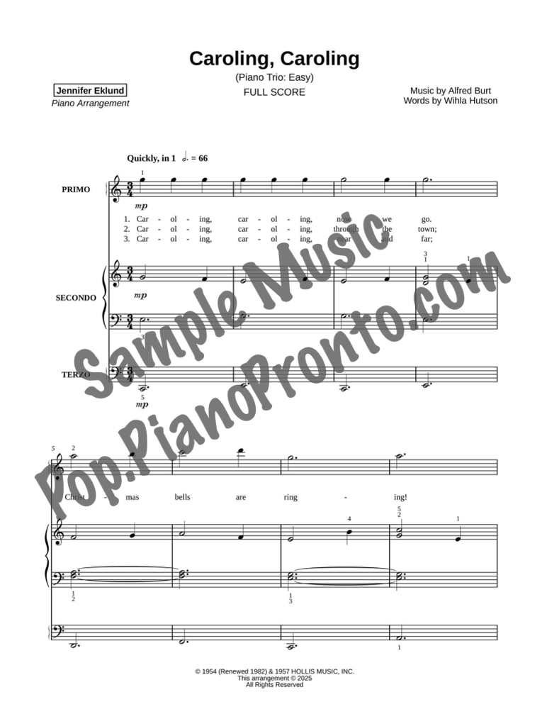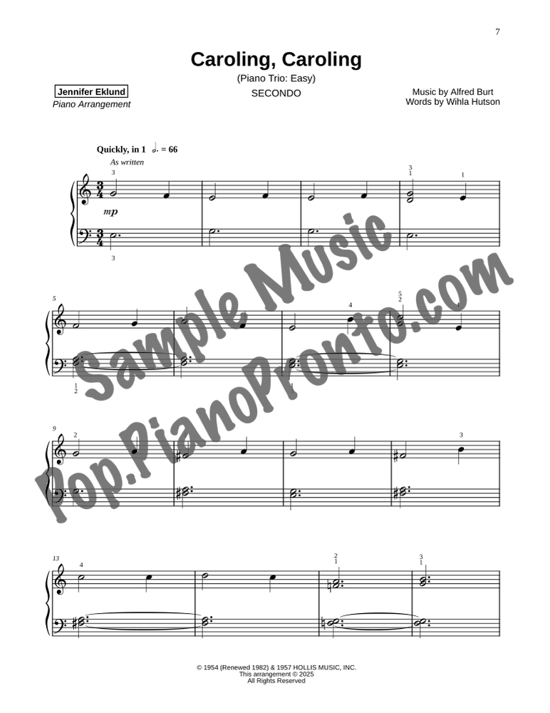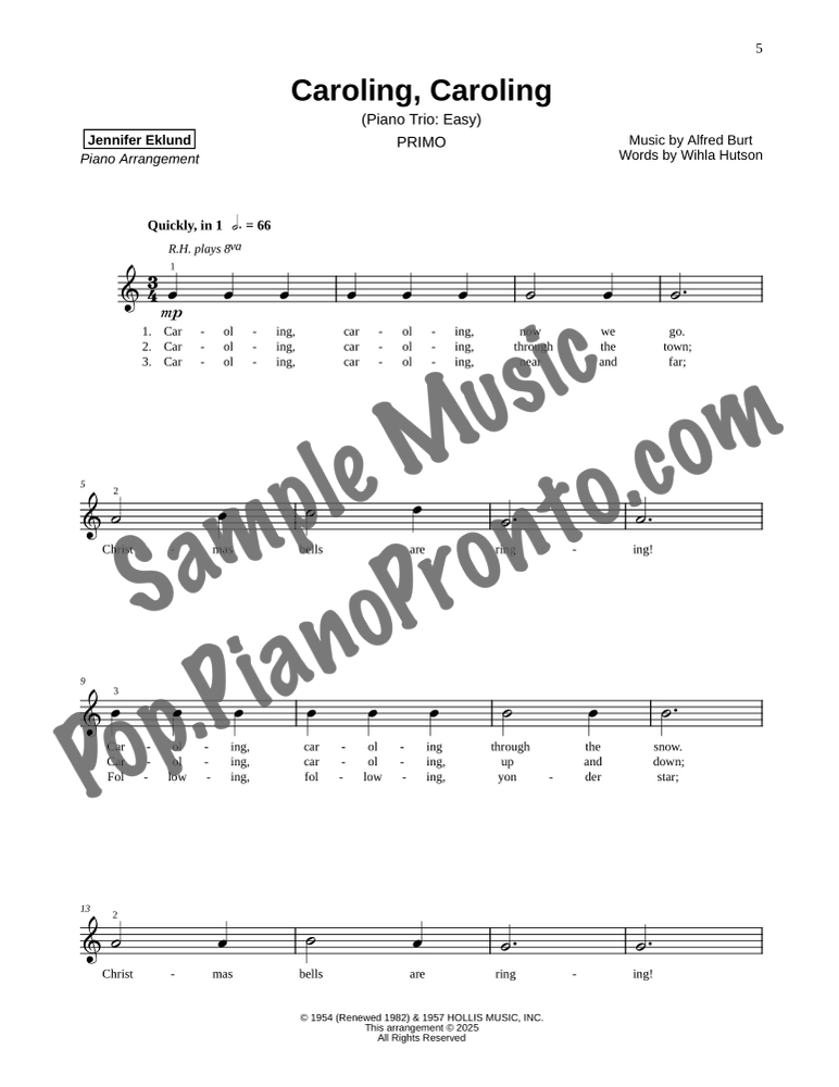 Caroling, Caroling, a lilting holiday classic, stylishly arranged as an easy trio for late beginners and early intermediates by Jennifer Eklund. This ensemble piece serves as a great introduction to easy collaborative playing and will also be effective in group piano settings with multiple keyboards. Purchase includes separated parts and a full conductors score.