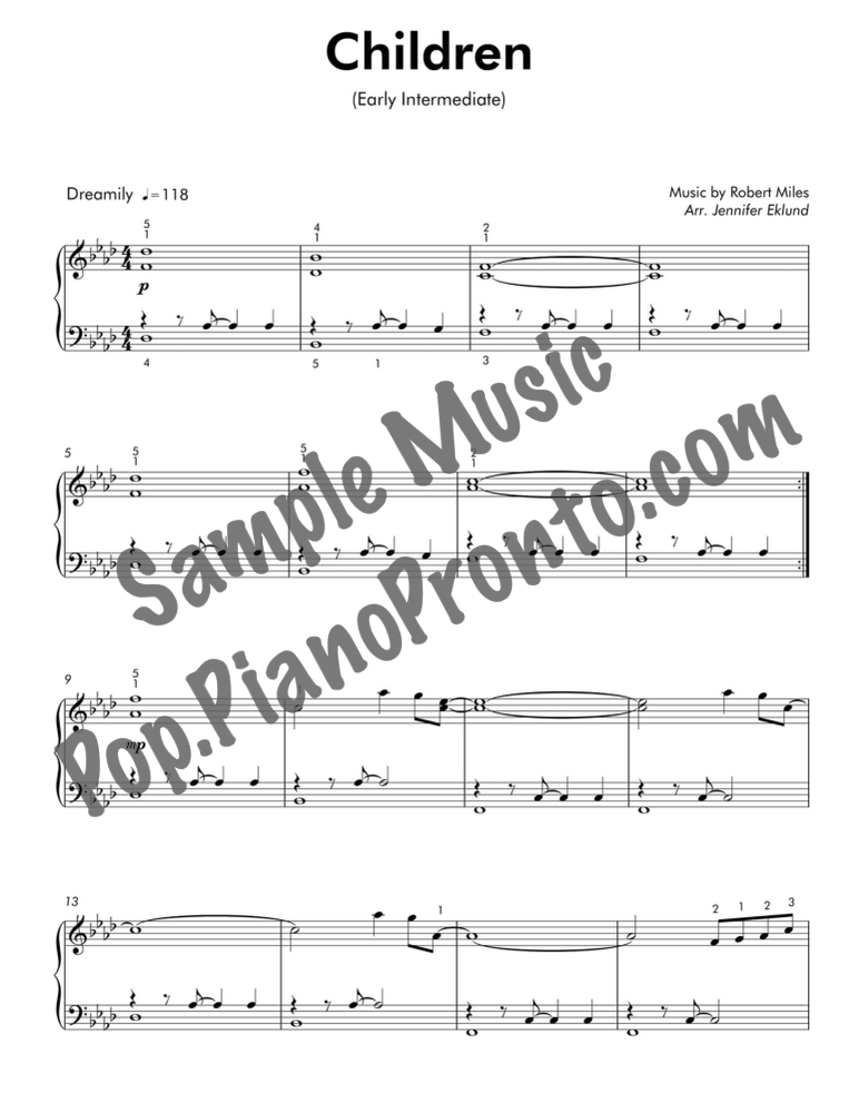Children, an iconic electronic music track by Robert Miles, set in a mild and mellow style for early intermediate piano by Jennifer Eklund.