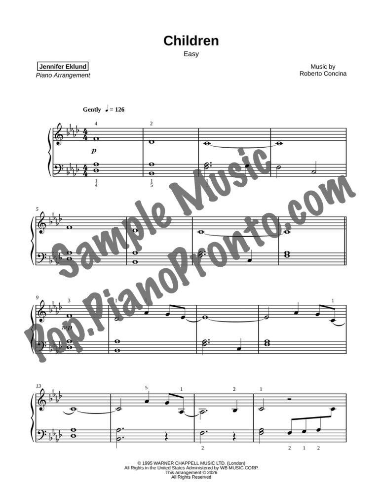 Children, an iconic electronic music track by Robert Miles, stylishly arranged for easy piano by Jennifer Eklund.