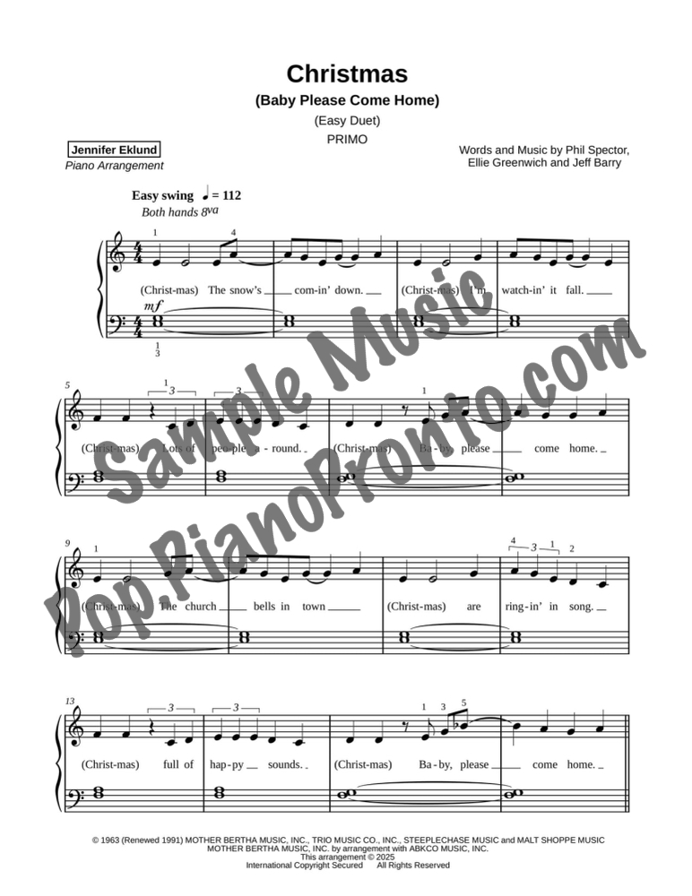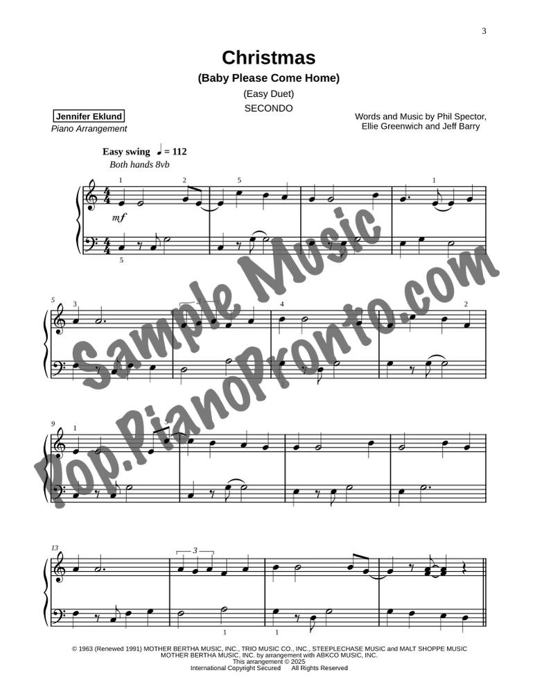 Christmas (Baby Please Come Home), a Motown holiday favorite, stylishly arranged as an evenly-leveled piano duet for late beginners and early intermediates by Jennifer Eklund.
