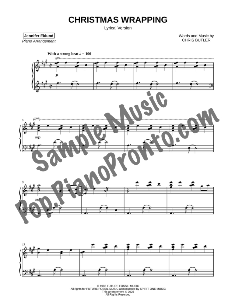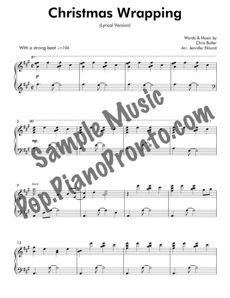 Christmas Wrapping, as performed by The Waitresses, set as a sparkling lyrical solo for late intermediate piano by Jennifer Eklund.