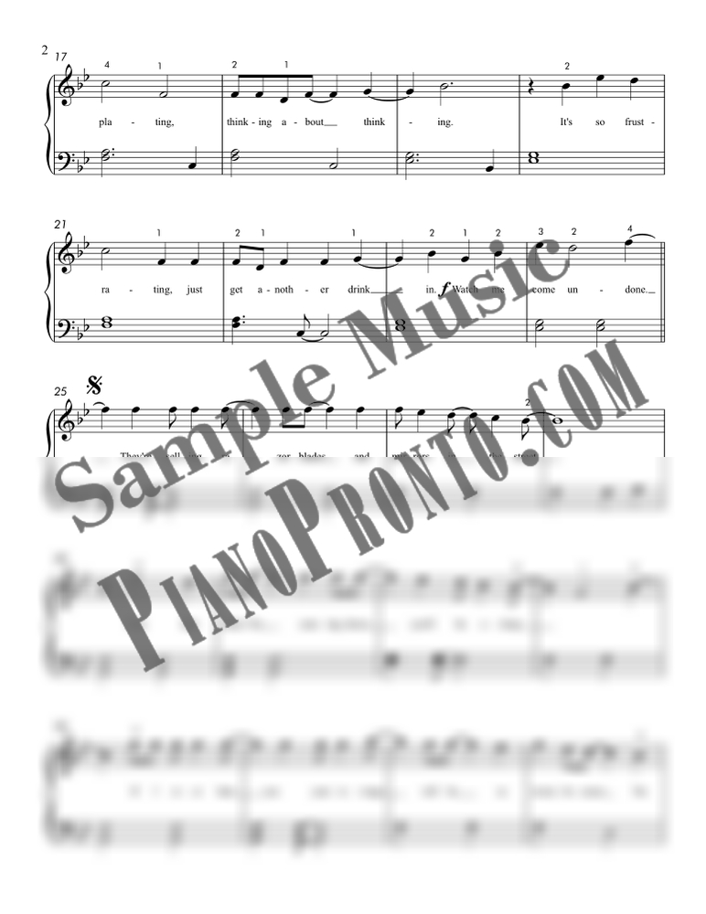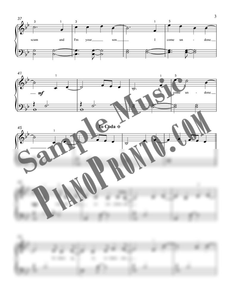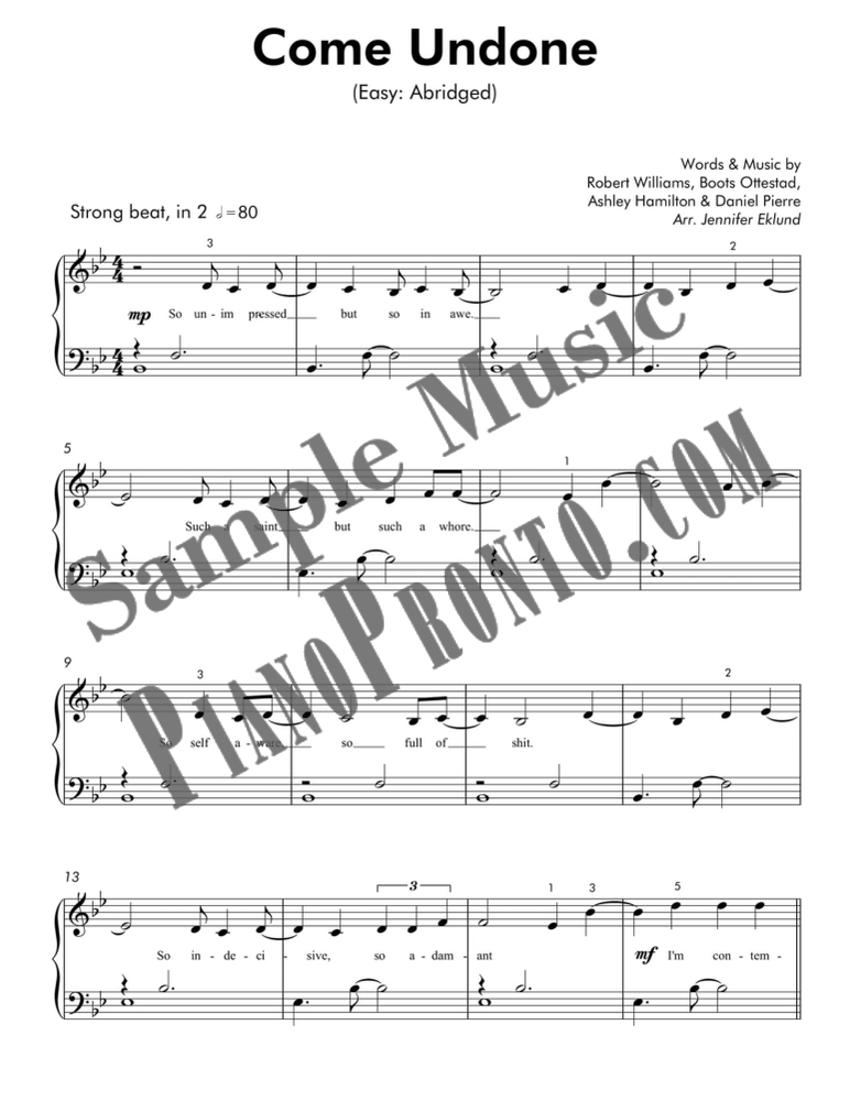 Come Undone, as performed by Robbie Williams, stylishly abridged and arranged for easy piano by Jennifer Eklund. This version is transposed down a half-step to the key of B-flat major.