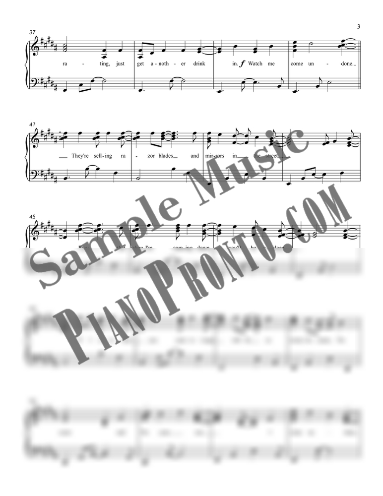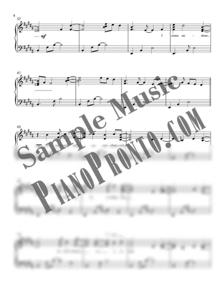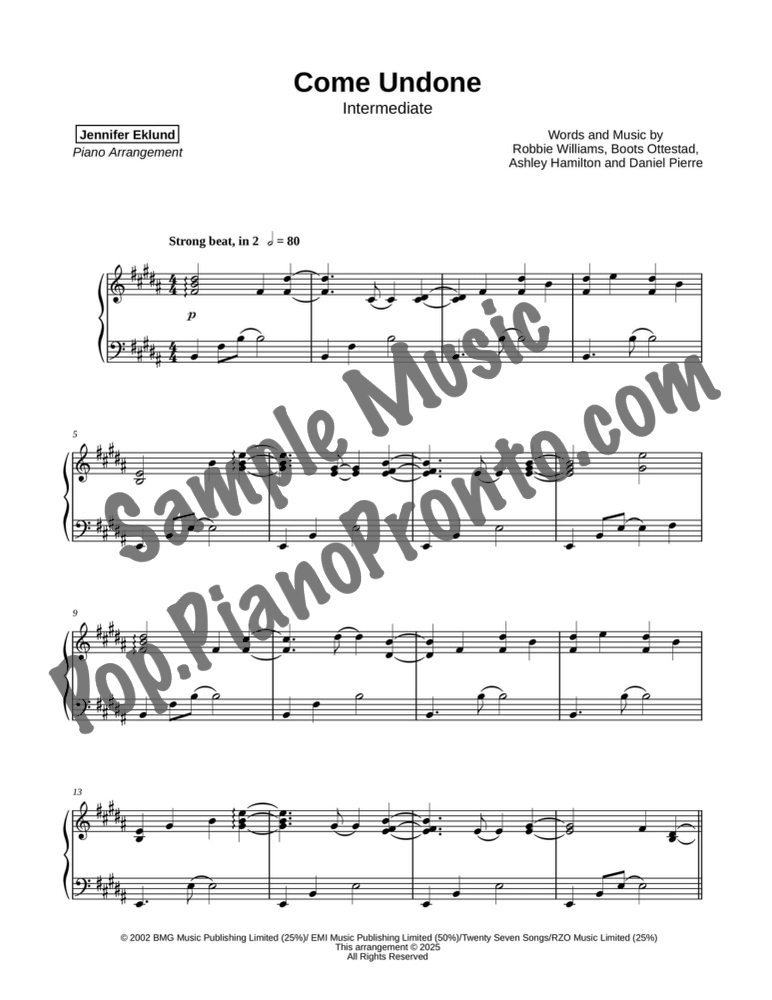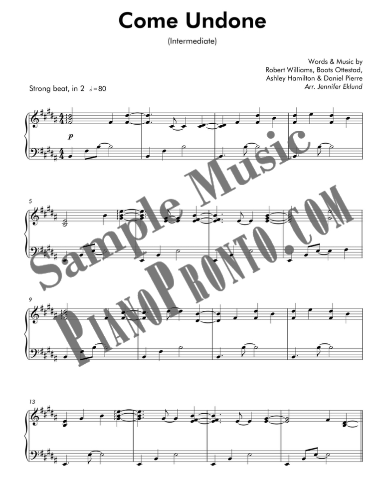Come Undone, as performed by Robbie Williams, set here as a sparkling lyrical piano solo for intermediates by Jennifer Eklund. This version is in the original key.