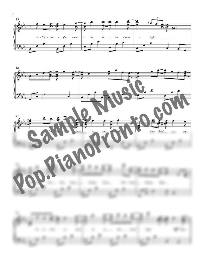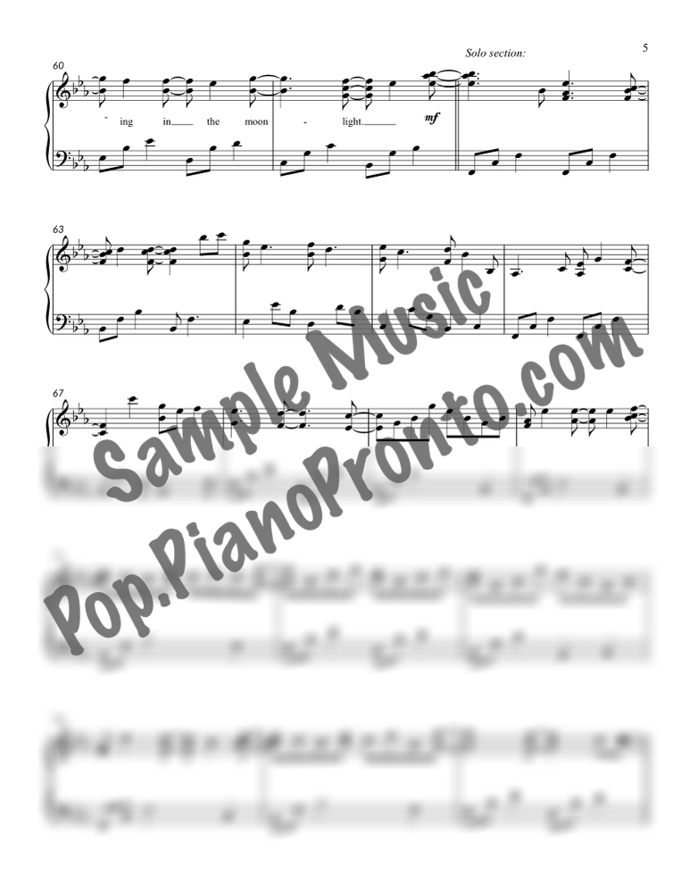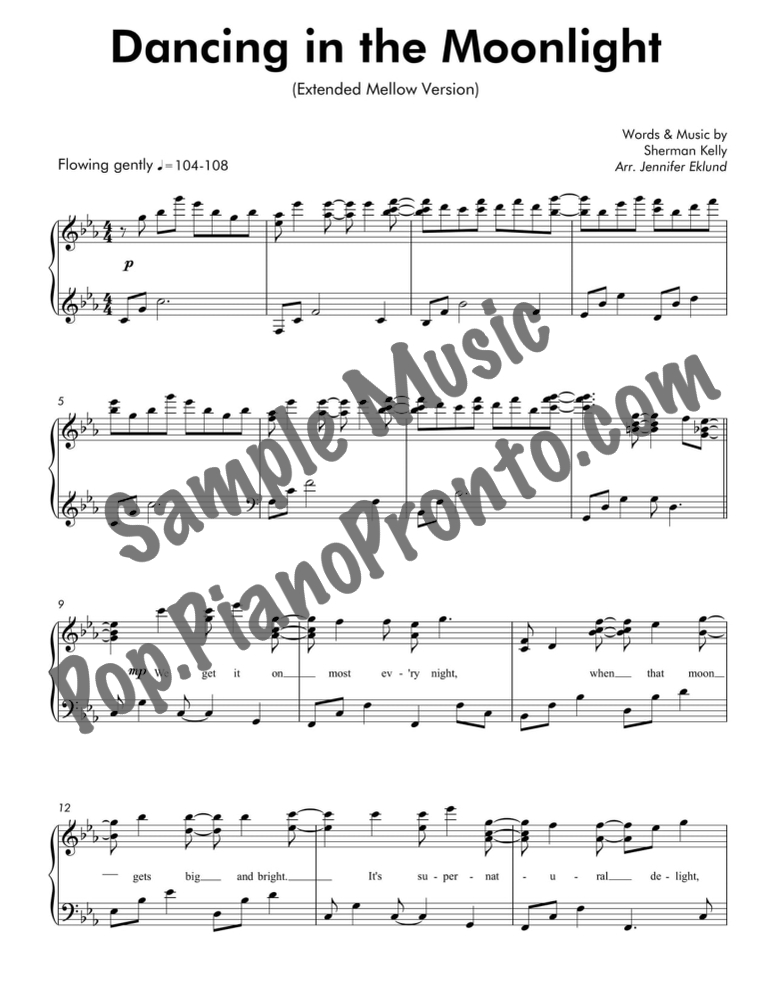 Dancing in the Moonlight, in a mellow extended arrangement for late intermediate piano by Jennifer Eklund. This version is a hybrid including sections from the original recording by King Harvest and the cover version by Toploader set at a slower tempo with a run-time around 4:45.
