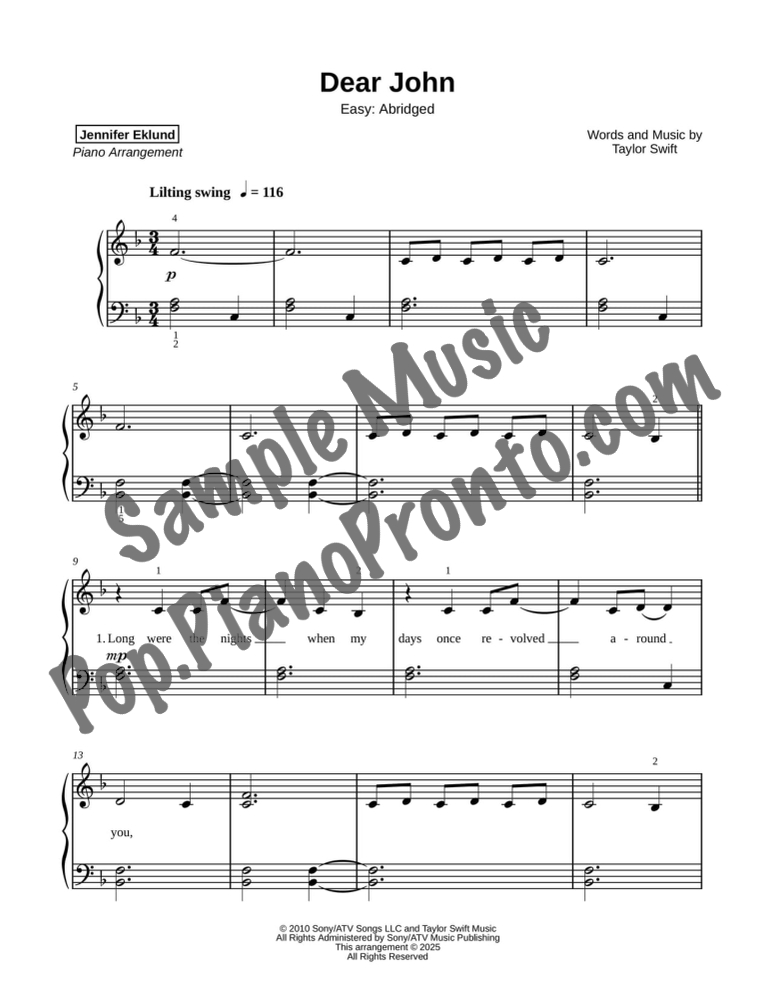 Dear John, as performed by Taylor Swift, stylishly arranged for easy piano by Jennifer Eklund. This is an abridged version with a run-time around 4 minutes.