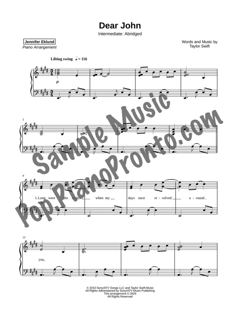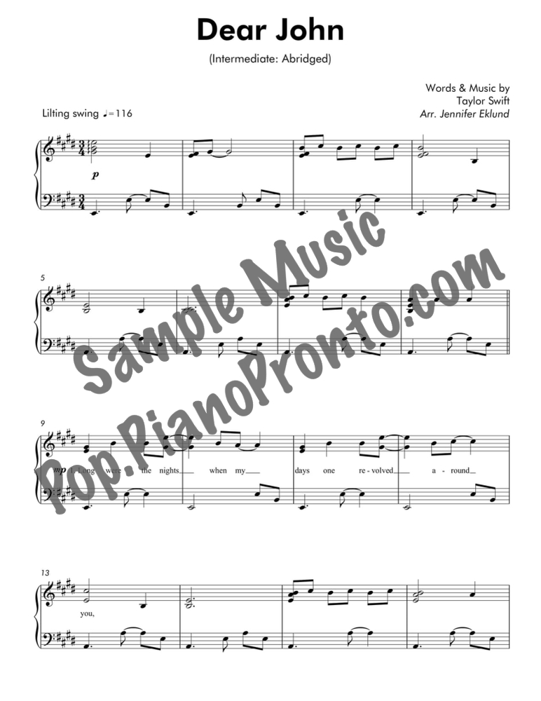 Dear John, as performed by Taylor Swift, in a sparkling lyrical arrangement by Jennifer Eklund. This is an abridged version with a run-time around 4 minutes.