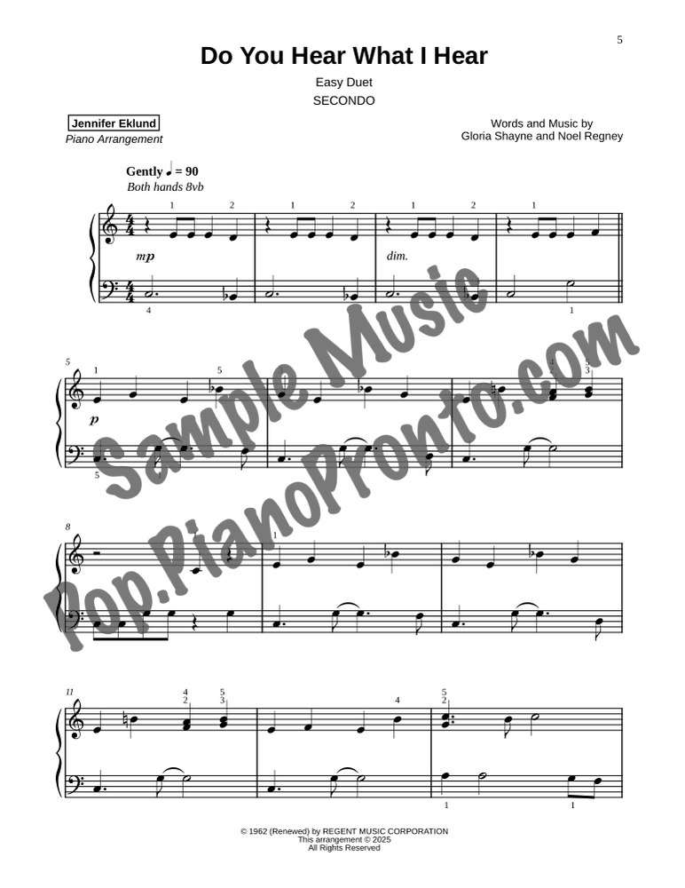 Do You Hear What I Hear, an evergreen holiday favorite, stylishly arranged as an evenly-leveled piano duet for late beginners by Jennifer Eklund.