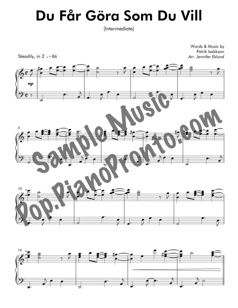 Du Får Göra Som Du Vill, a Swedish pop music classic from 1999, as performed by Patrik Isaksson, arranged for intermediate piano by Jennifer Eklund.