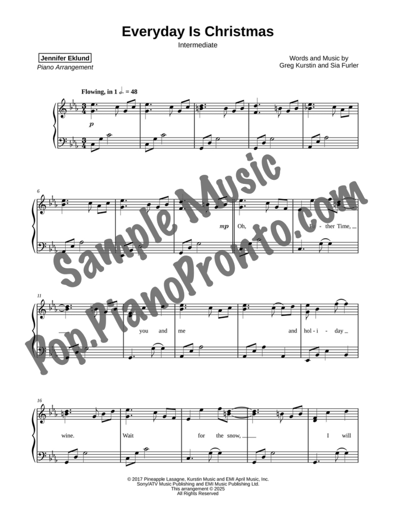 Everyday Is Christmas, as performed by Sia, set as a lyrical solo for intermediate piano by Jennifer Eklund.