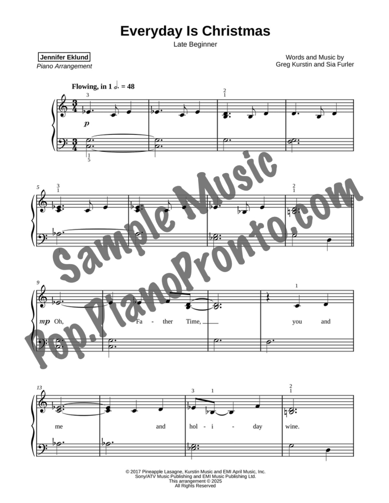 Everyday Is Christmas, as performed by Sia, stylishly arranged for late beginner piano by Jennifer Eklund.