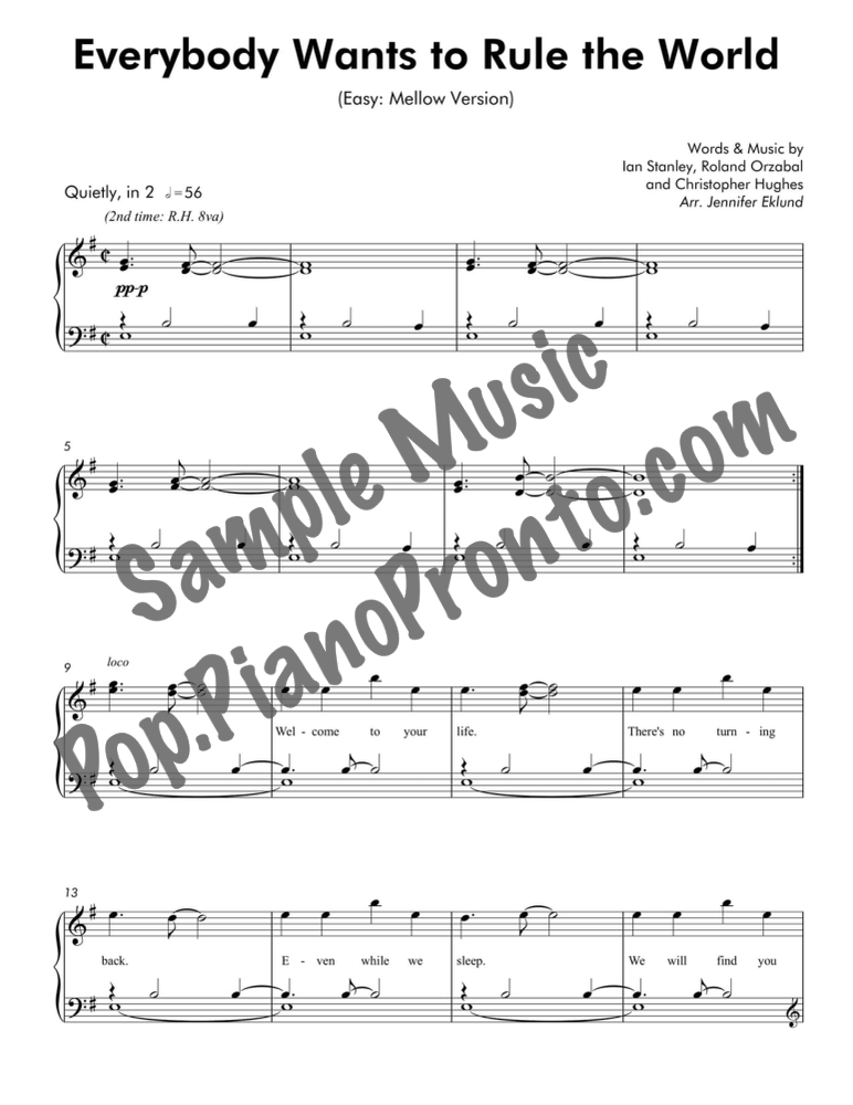 Everybody Wants to Rule the World, in a mellow arrangement for early intermediate piano by Jennifer Eklund. This mellow version has a total run-time around 3:45.
