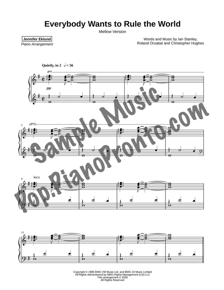 Everybody Wants to Rule the World, in a mellow extended arrangement for late intermediate piano by Jennifer Eklund. This mellow version has a total run-time around 5:00.