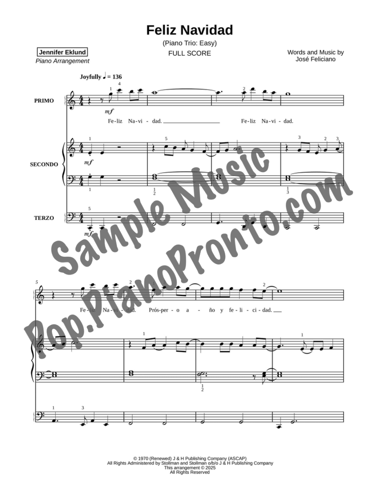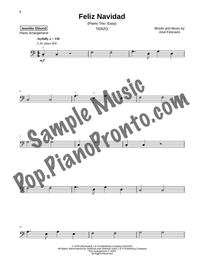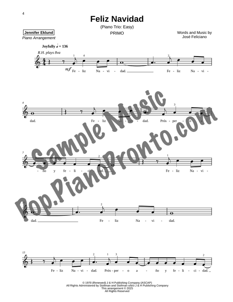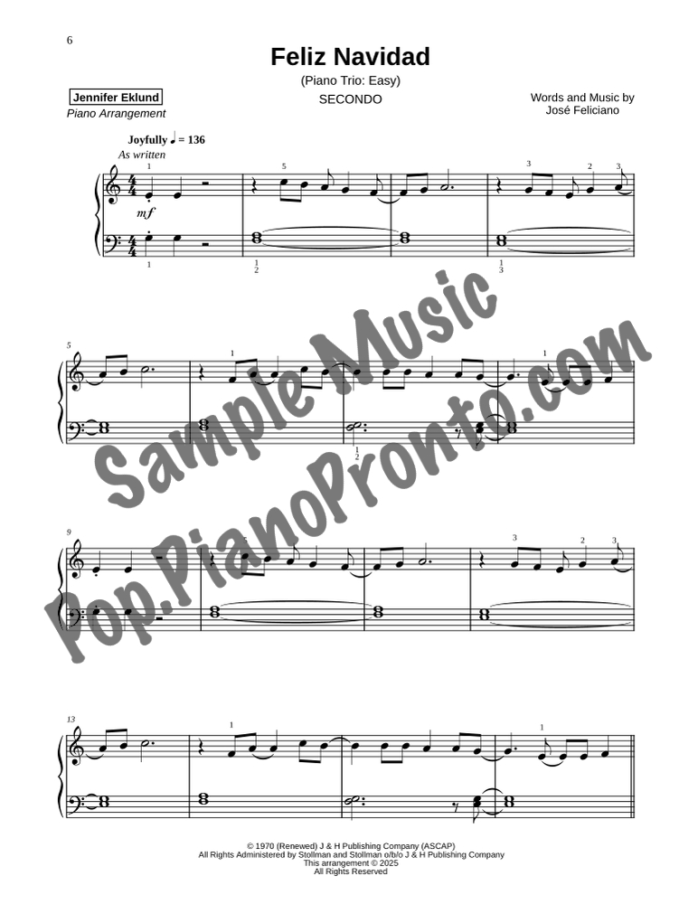 Feliz Navidad, an upbeat holiday favorite, stylishly arranged as an easy trio for late beginners and early intermediates by Jennifer Eklund. This ensemble piece serves as a great introduction to easy collaborative playing and will also be effective in group piano settings with multiple keyboards. Purchase includes separated parts and a full conductors score.