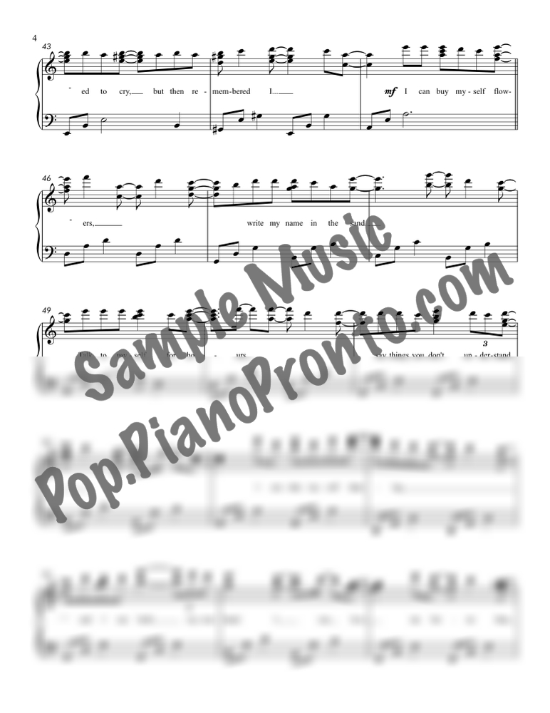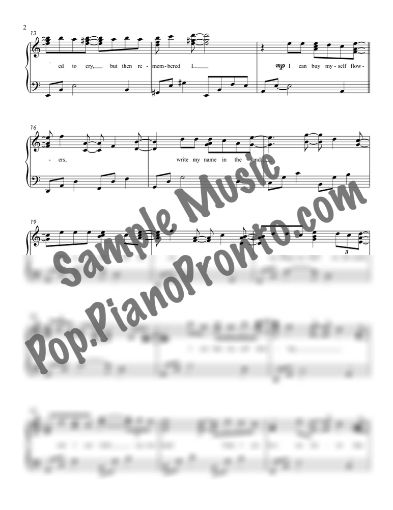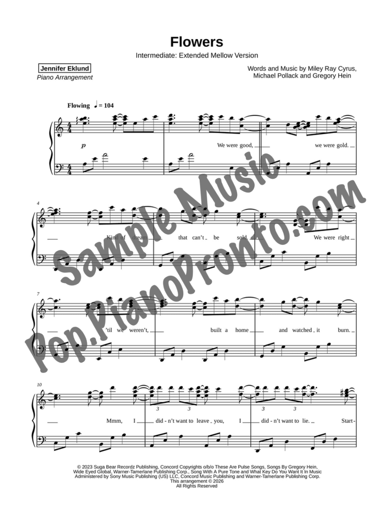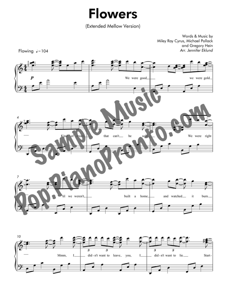 Flowers, as performed by Miley Cyrus, reimagined in a mellow arrangement for late intermediate piano by Jennifer Eklund. This extended version has a total run-time around 4:45.