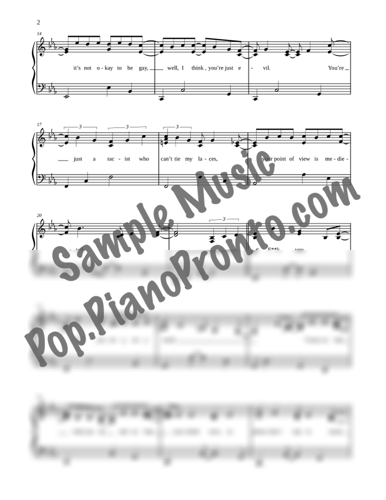 F**k You, as performed by Lily Allen, stylishly arranged for intermediate piano by Jennifer Eklund. This version is transposed down a half-step to the key of E-flat major and has the vocal line set in the recorded range.