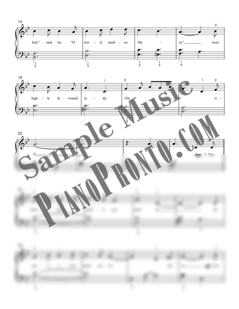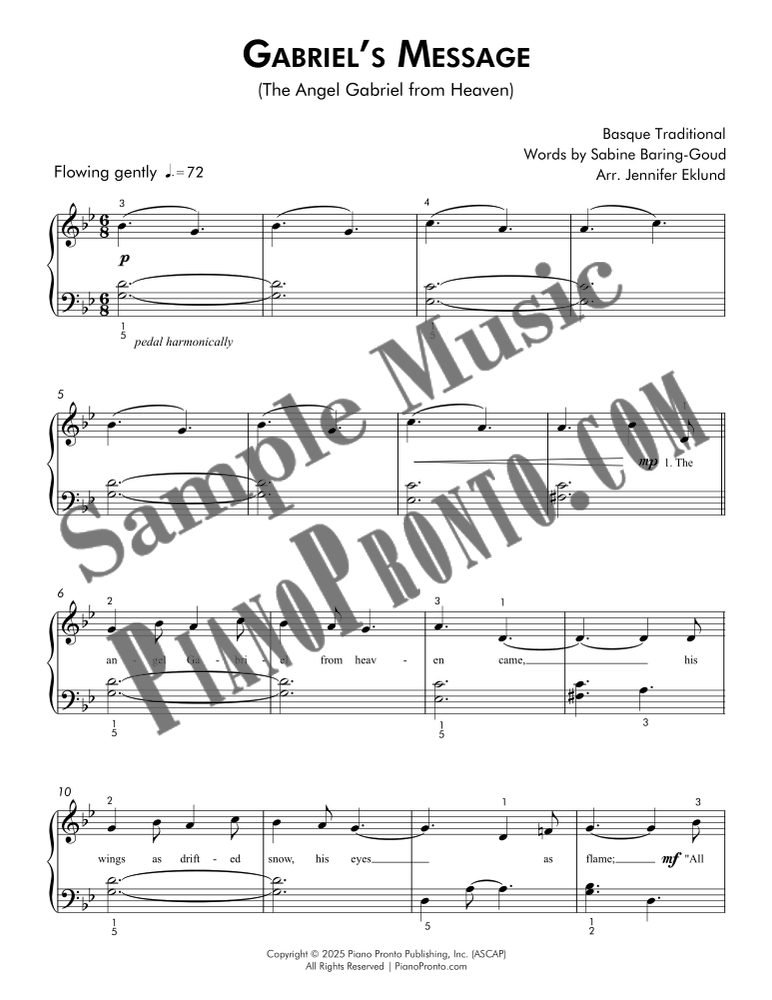 Gabriel’s Message (The Angel Gabriel from Heaven), a traditional Basque carol, in a peaceful lyrical setting for late beginners by Jennifer Eklund. The shifting meters have been adjusted in this version to accommodate the level of the arrangement.