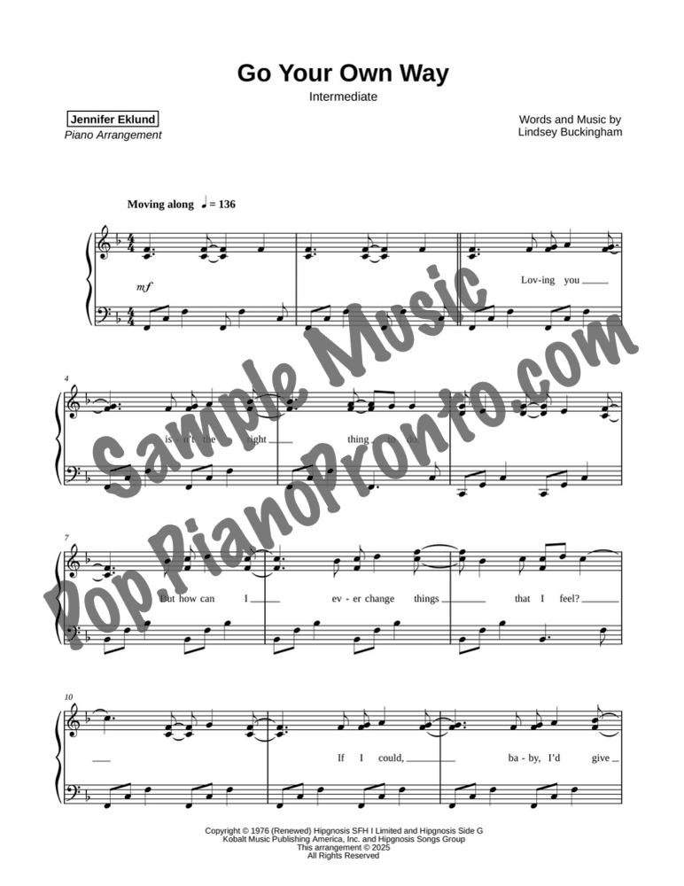 Go Your Own Way, as performed by Fleetwood Mac, stylishly arranged for intermediate piano by Jennifer Eklund.