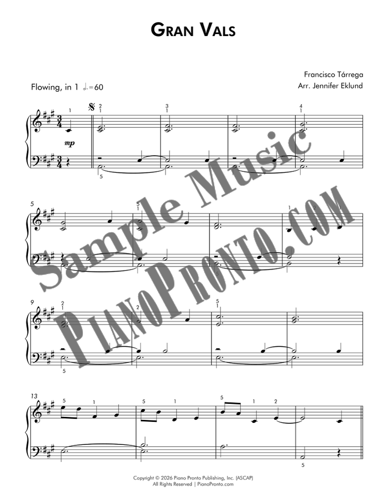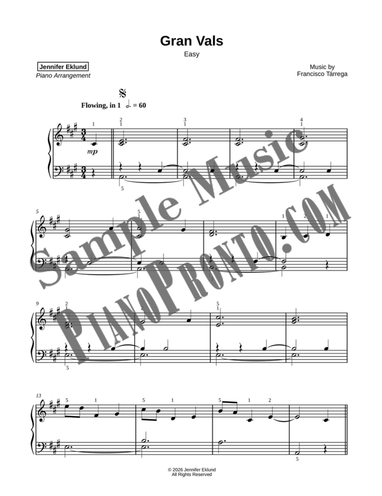 Francisco Tárrega's iconic Gran Vals, which also happens to include the iconic Nokia cell phone ringtone, arranged for easy piano by Jennifer Eklund.