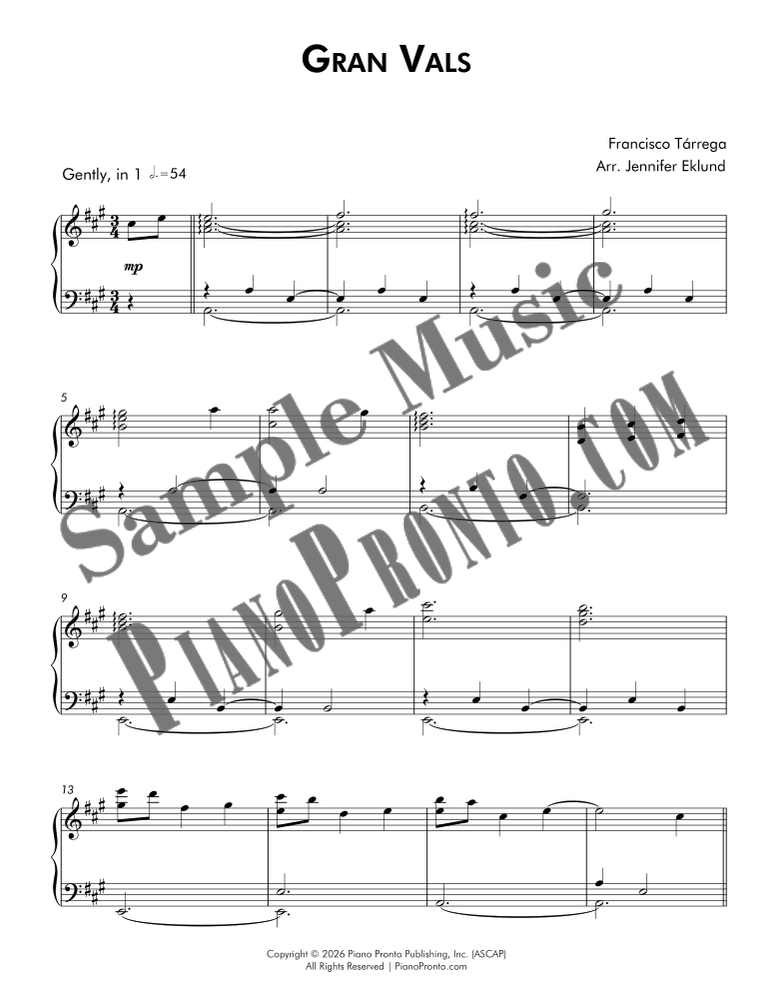 Francisco Tárrega's iconic Gran Vals, which also happens to include the iconic Nokia cell phone ringtone, stylishly arranged in the original key for intermediate piano by Jennifer Eklund.