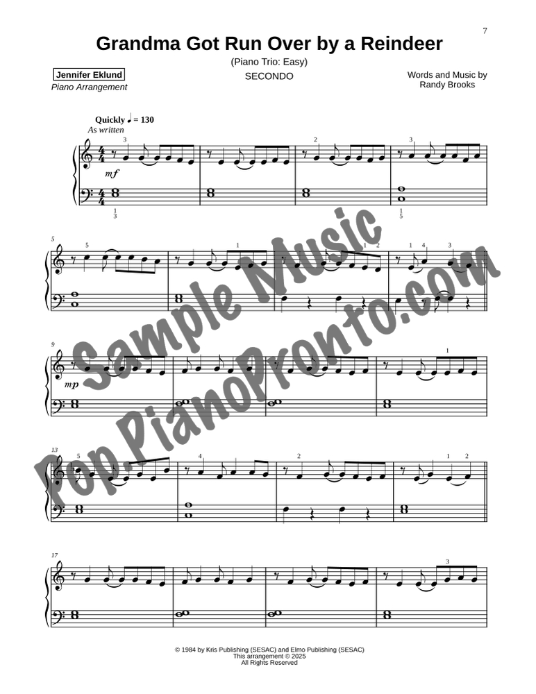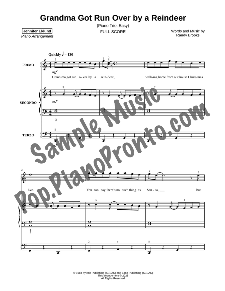 Grandma Got Run Over by a Reindeer, a jovial holiday favorite, stylishly arranged as an easy trio for late beginners and early intermediates by Jennifer Eklund. This ensemble piece serves as a great introduction to easy collaborative playing and will also be effective in group piano settings with multiple keyboards. Purchase includes separated parts and a full conductors score.