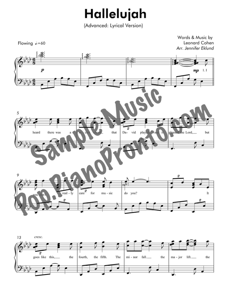 Hallelujah, featuring words & music by Leonard Cohen, set here as a sparkling stylized lyrical piano solo for late intermediates and up by Jennifer Eklund.