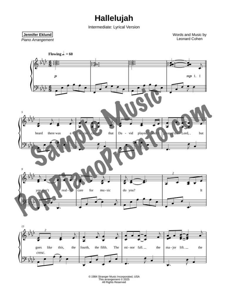 Hallelujah, featuring words & music by Leonard Cohen, set here as an uplifting stylized lyrical piano solo for intermediates and up by Jennifer Eklund.