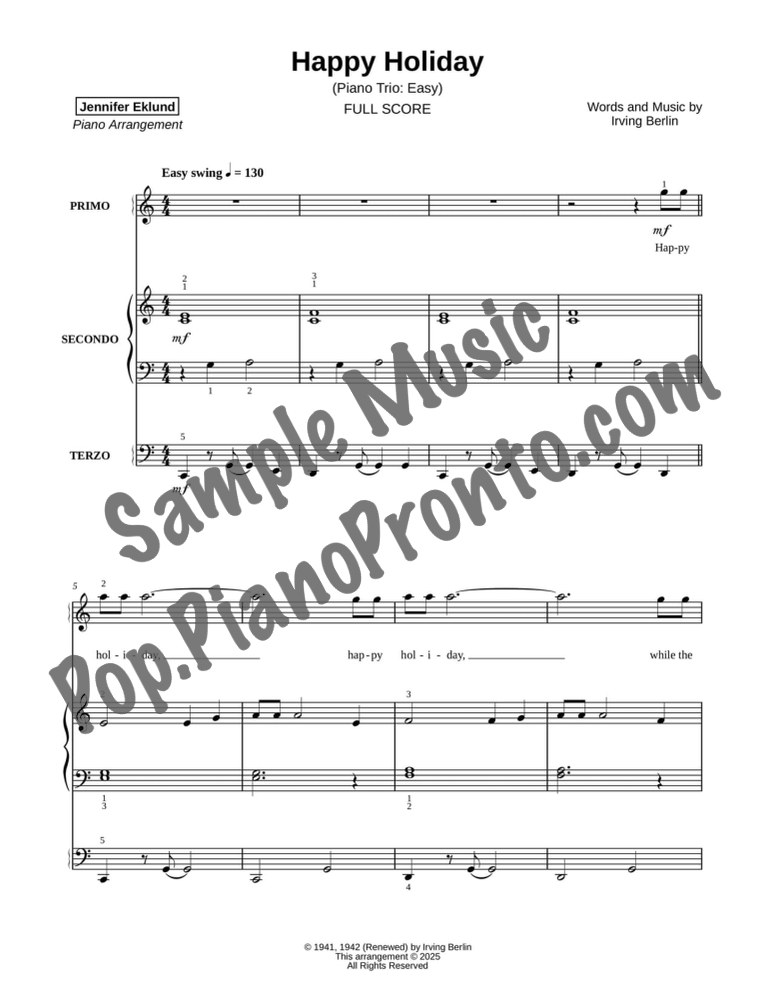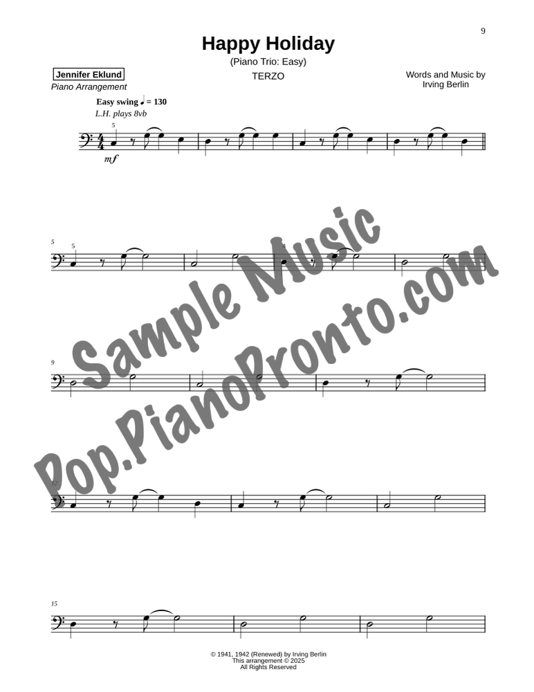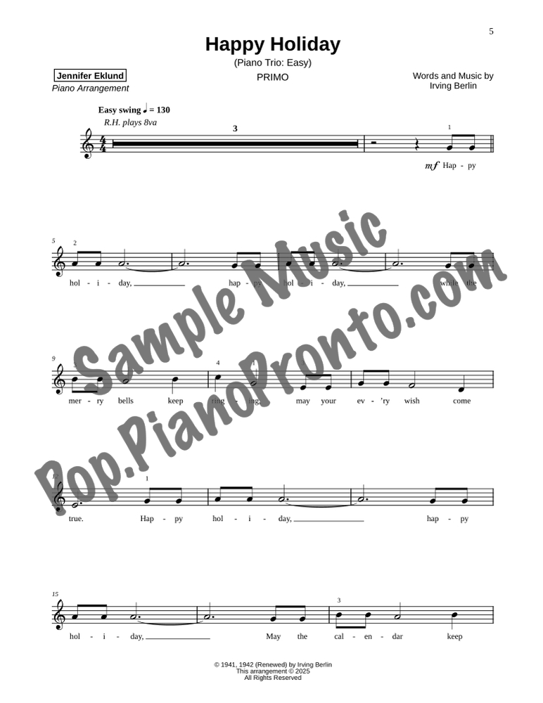 Happy Holiday, an upbeat holiday favorite, stylishly arranged as an easy trio for late beginners and early intermediates by Jennifer Eklund. This ensemble piece serves as a great introduction to easy collaborative playing and will also be effective in group piano settings with multiple keyboards. Purchase includes separated parts and a full conductors score.