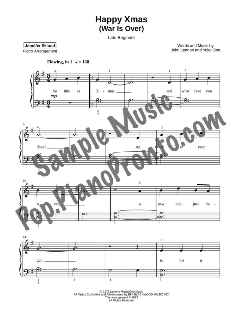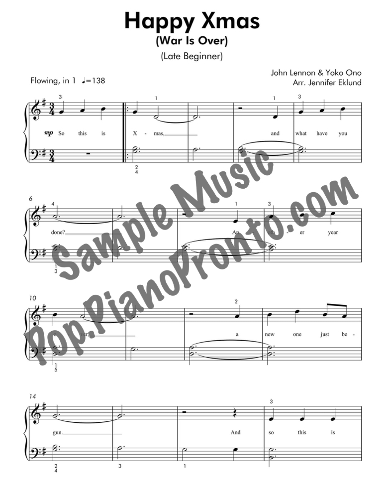 Happy Xmas (War Is Over), as performed by John Lennon, stylishly abridged and arranged for late beginner piano by Jennifer Eklund.