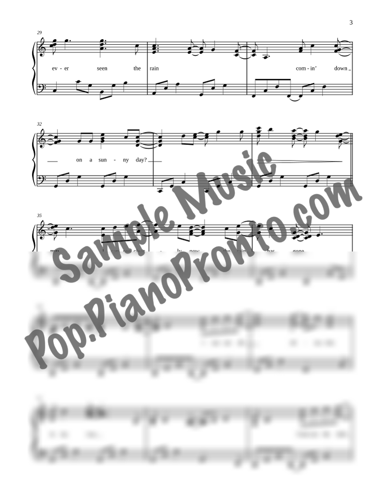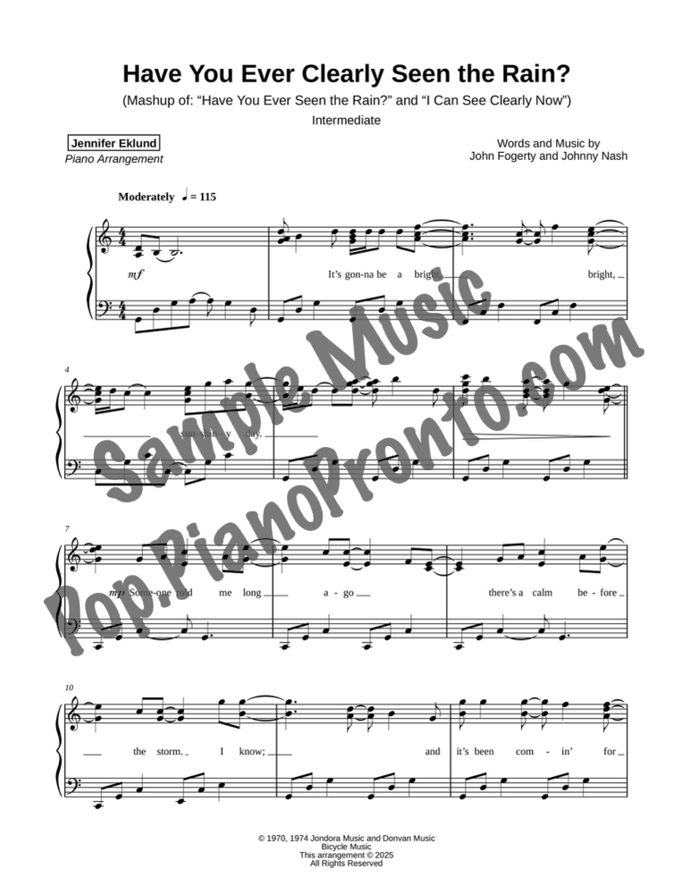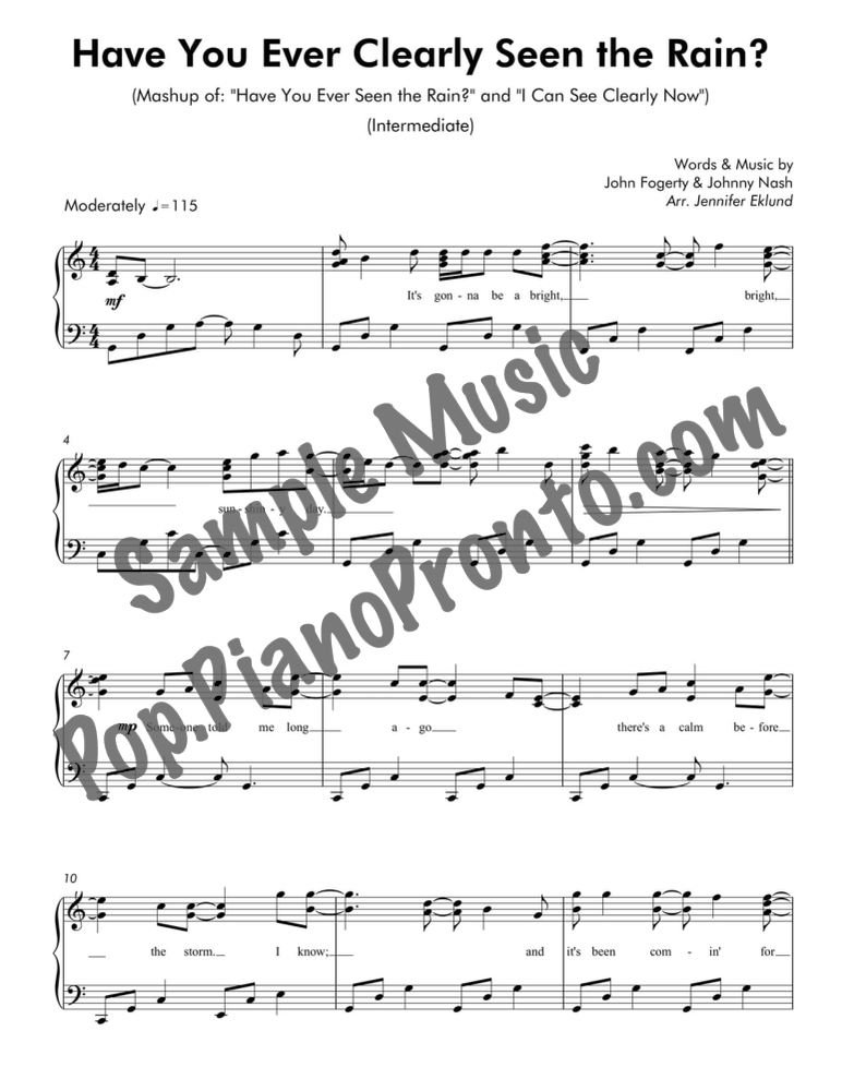 Have You Ever Clearly Seen the Rain?, is a mashup of two 1970s classics, "Have You Ever Seen the Rain?" by Creedence Clearwater Revival and "I Can See Clearly Now" by Johnny Nash, arranged for intermediate piano by Jennifer Eklund.