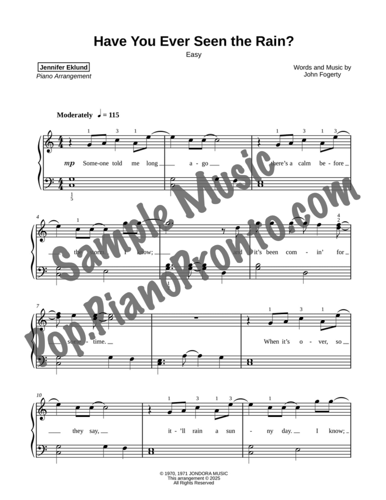 Have You Ever Seen the Rain?, as performed by Creedence Clearwater Revival, stylishly arranged for easy piano by Jennifer Eklund.
