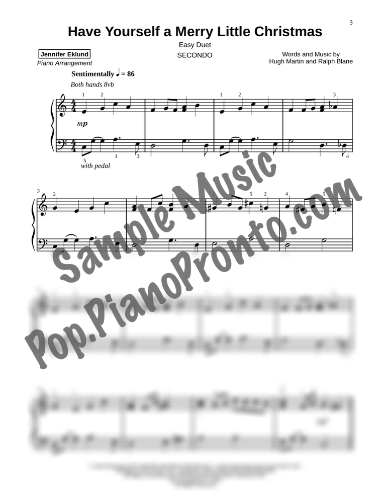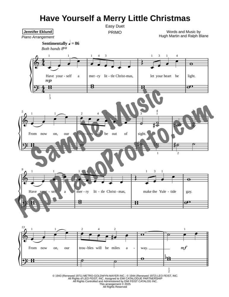 Have Yourself a Merry Little Christmas, a nostalgic holiday favorite, stylishly arranged as an evenly-leveled piano duet for late beginners and early intermediates by Jennifer Eklund.