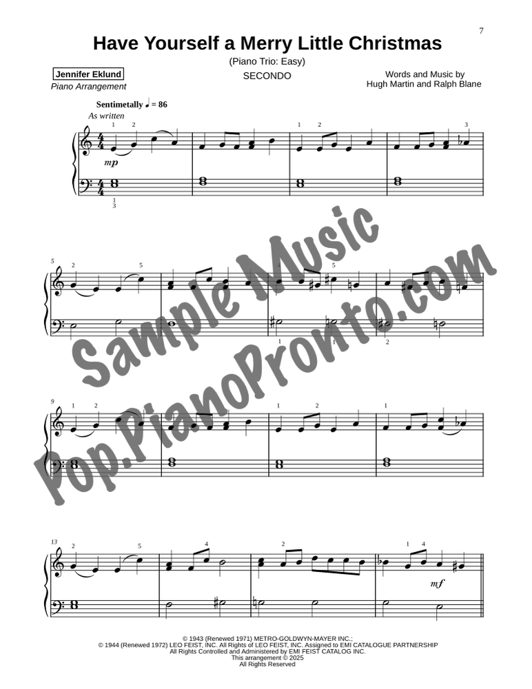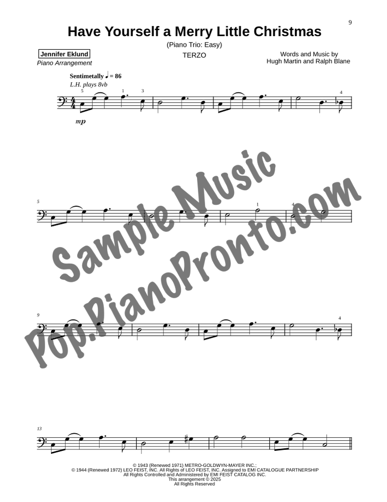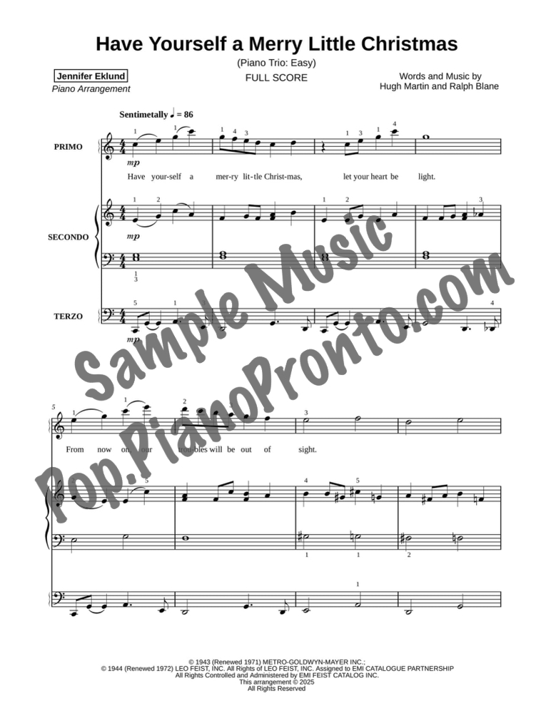 Have Yourself a Merry Little Christmas, a nostalgic holiday favorite, stylishly arranged as an easy trio for late beginners and early intermediates by Jennifer Eklund. This ensemble piece serves as a great introduction to easy collaborative playing and will also be effective in group piano settings with multiple keyboards. Purchase includes separated parts and a full conductors score.