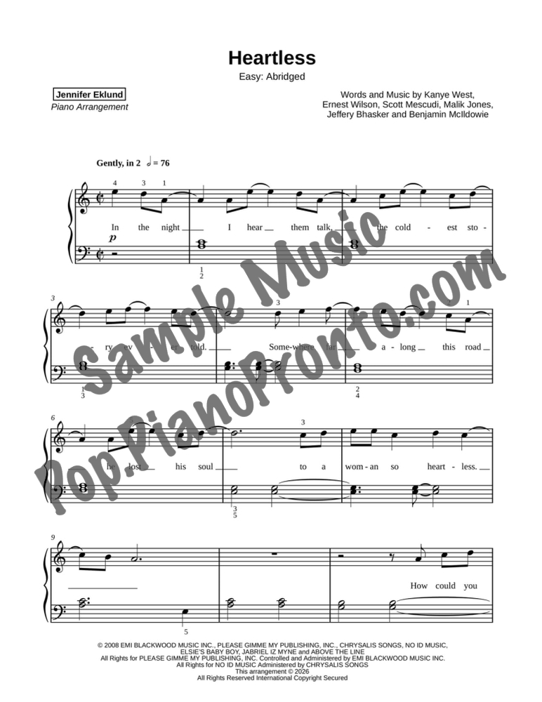 Heartless, as performed by Kanye West, in a stylishly abridged arrangement for easy piano by Jennifer Eklund.