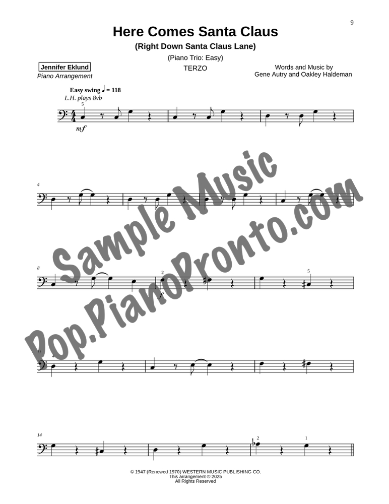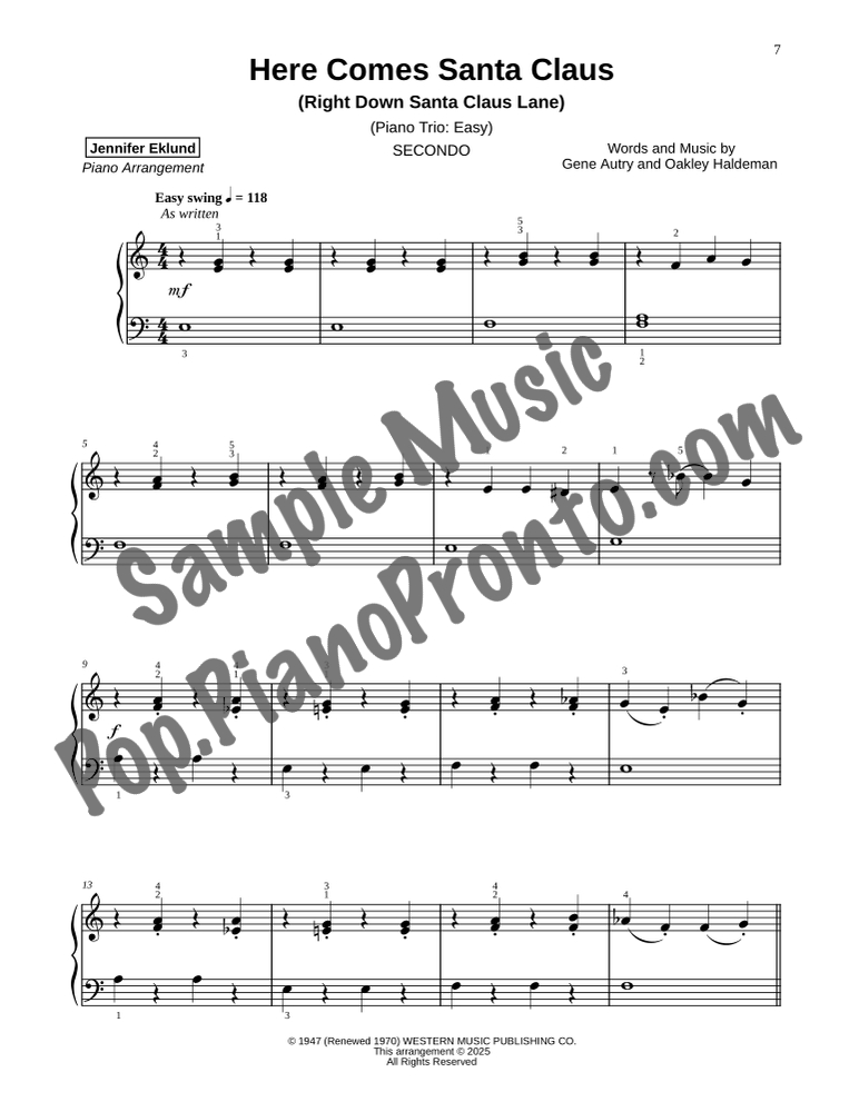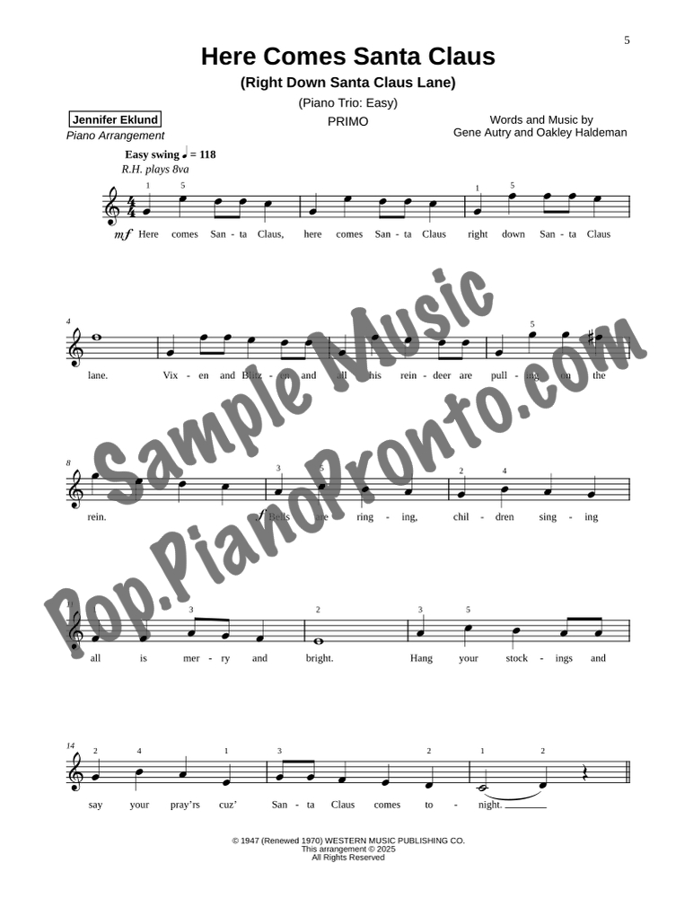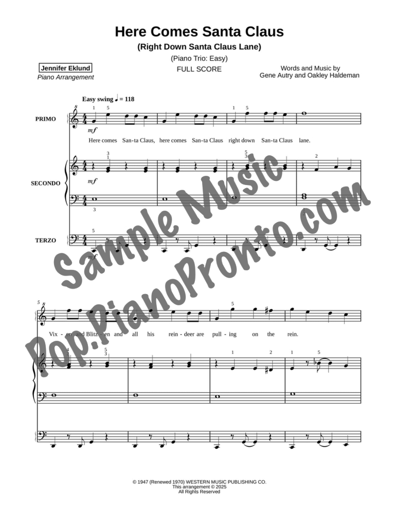 Here Comes Santa Claus (Right Down Santa Claus Lane), a joyful holiday favorite, stylishly arranged as an easy trio for late beginners and early intermediates by Jennifer Eklund. This ensemble piece serves as a great introduction to easy collaborative playing and will also be effective in group piano settings with multiple keyboards. Purchase includes separated parts and a full conductors score.