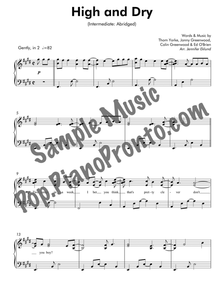 High and Dry, as performed by Radiohead, stylishly abridged and arranged for intermediate piano by Jennifer Eklund. This shortened version has a run-time of 3 minutes.