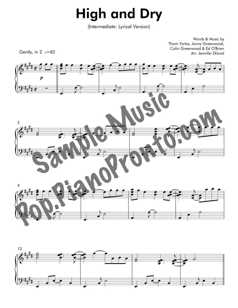High and Dry, as performed by Radiohead, in a sparkling lyrical arrangement for intermediate piano by Jennifer Eklund.